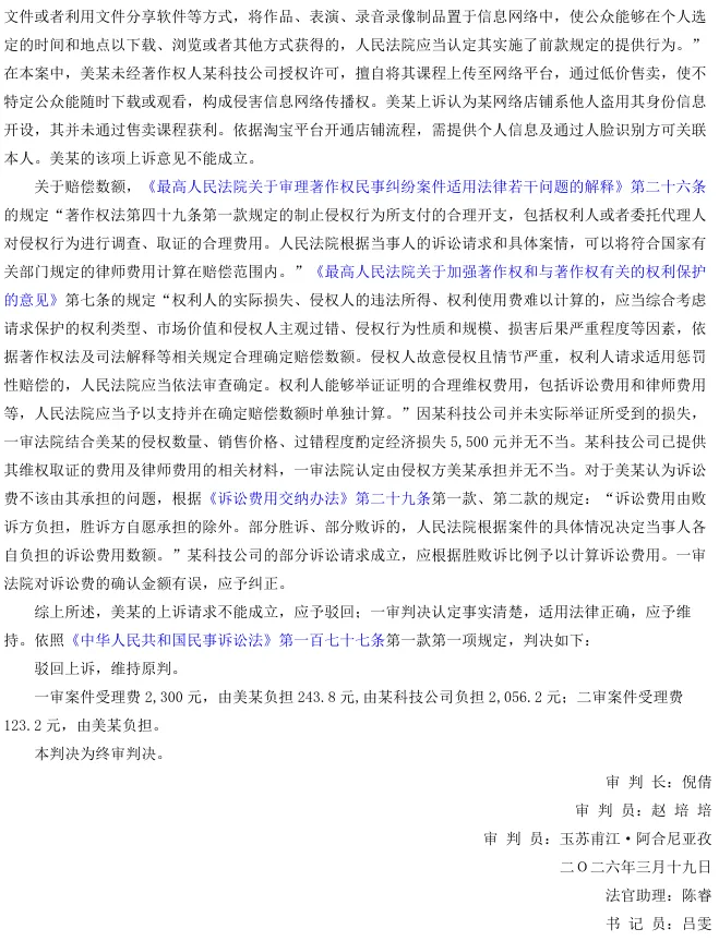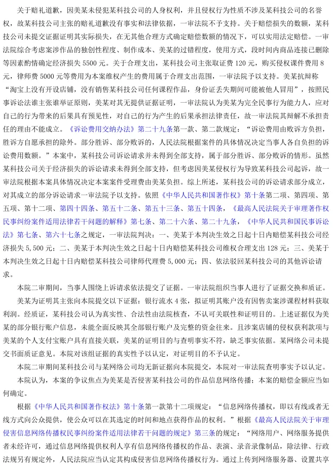 一审法院认为,美某的行为构成侵害作品信息网络传播权,应承担停止侵权和赔偿损失的民事责任。鉴于侵权商品已下架,停止侵权的请求已无必要;赔礼道歉缺乏依据,不予支持。关于赔偿数额,因某科技公司未举证实际损失,一审法院综合考虑作品独创性、美某过错程度、侵权方式等因素,酌定经济损失5,500元,并支持合理维权支出128元及律师费5,000元。一审案件受理费2,300元,由美某负担243.8元,某科技公司负担2,056.2元。美某不服,提起上诉。