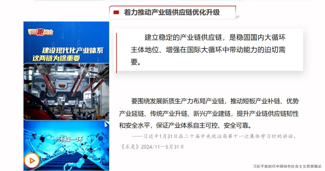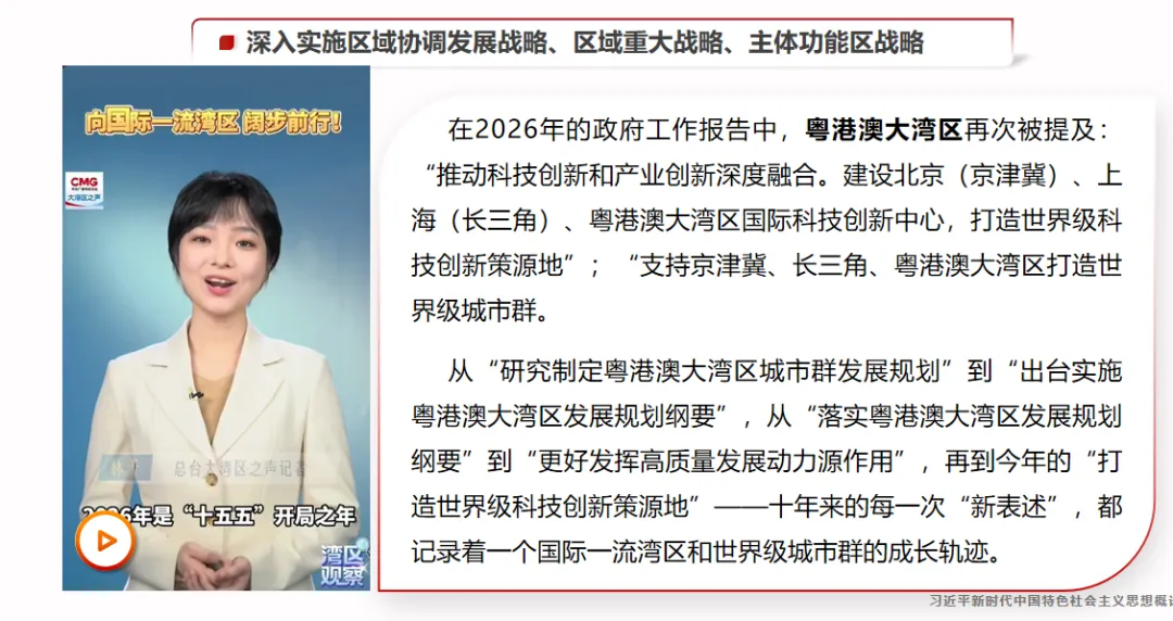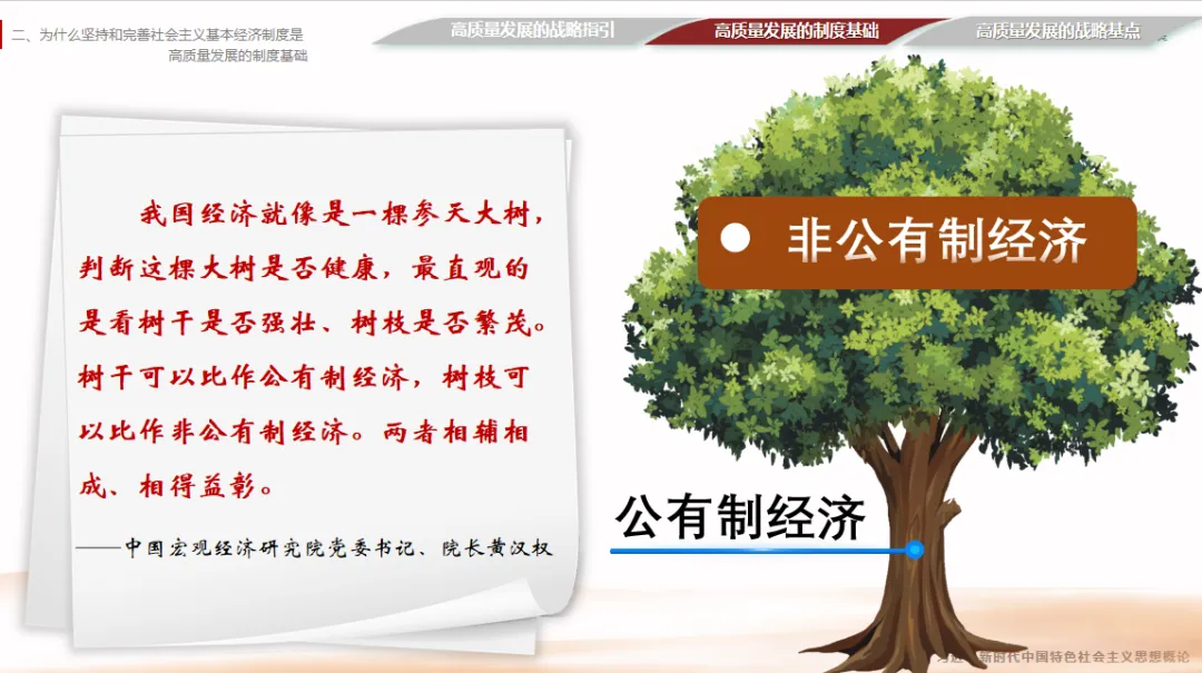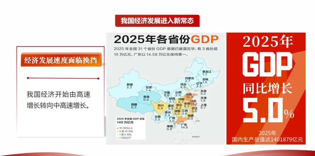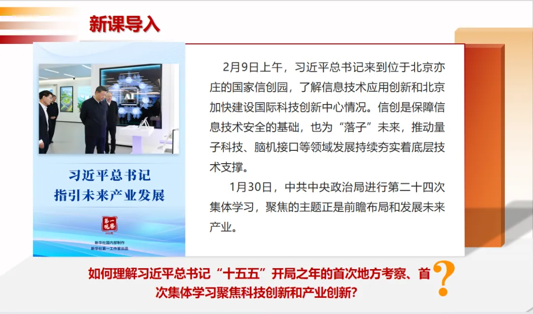 【P3】首先,我们通过两组开年的新闻,一起来感受时代发展的脉搏,看看国家当前最关注的发展重点是什么。2月9日上午,习近平总书记来到位于北京亦庄的国家信创园,实地考察调研,详细了解信息技术应用创新产业发展情况,以及北京加快建设国际科技创新中心的进展。大家要知道,信创产业是保障我国信息技术安全、打破外部技术垄断的基础,更是为我们“布局未来”,推动量 子科技、脑机接口、人工智能等前沿领域发展,持续夯实底层技术支撑的关键。与此同时,1月30日,中共中央政治局进行第二十四次集体学习,聚焦的主题正是前瞻布局和发展未来产业,为高质量发展培育新的增长极。同学们,大家认真思考一下:在“十五五”开局之年,总书记的首次地方考察、中央政治局的首次集体学习,都聚焦于科技创新和产业创新,这背后释放出的信号是什么?这个信号非常明确,科技创新是高质量发展的核心驱动力,产业创新是高质量发展的主要载体,没有科技自立自强,没有产业迭代升级,高质量发展就无从谈起、无从落地。首先我们进入第一部分的学习。为了帮助大家更直观、更深刻地理解新发展阶段,我们不妨有请我们的AI助手,来分析下近年来,我国经济情况发生了哪些变化?为什么我们要进入新发展阶段,而不是继续追求过去的高速增长?接下来,我们就借助具体的数据和分析,一起来看看中国经济的“基本面”发生了哪些深刻改变,从而理解进入新发展阶段的必然性。【P12】从AI给出的答案可以看出,最显著的变化是,我国经济发展进入了新常态。大家要注意,新常态不是短期的经济波动,而是我国经济发展到一定阶段后的长期发展趋势,是不可逆转的。大家可以看向右边这张“2006—2025年我国国内生产总值及增长率”图,从图表中能清晰看出,我国国内生产总值稳步增长,但增长率呈现放缓态势,这正是新常态的直观体现。具体来看,新常态的特征可以概括为“三期叠加”,这也是理解中国经济现状的关键。第一,增长速度换挡期;第二,结构调整阵痛期;第三,前期刺激政策消化期。理解了这“三期”,我们就能明白,为什么我们不能再用过去的旧眼光看待当前的经济发展,为什么不能再单纯追求经济增速,而是要转向高质量发展。【P21】我们刚才提到,进入新发展阶段的现实依据是拥有雄厚的物质基础,那么我们凭什么说拥有这样的底气?接下来,我们用一组数据说话,这就是我们的底气,也是我们推动高质量发展的基础。目前,我国是世界第一工业国、世界第一货物贸易国;是世界第二经济体、世界第二服务贸易国;从日常生产来看,我们每天能生产汽车8万多辆,智能手机340多万台,快递包裹4.7亿多件,这些数据都彰显了我国强大的生产能力;从全球贡献来看,我国经济总量约占全球的18%,对全球经济增长的贡献在30%左右,是全球经济增长的重要引擎。这些成就的取得,为我们迈向新发展阶段、推动高质量发展提供了坚实支撑,也让我们更有信心、更有底气实现第二个百年奋斗目标。【P24】新发展理念具体包含五个方面,也就是我们常说的“创新、协调、绿色、开放、共享”,接下来我们逐一讲解,首先是创新,创新注重解决发展动力问题。创新是一个国家、一个民族发展进步的不竭动力,是引领发展的第一动力。在新时代,我们要完善科技创新体系,坚持创新在我国现代化建设全局中的核心地位,把科技自立自强作为国家发展的战略支撑。重大科技创新成果是国之重器、国之利器,直接关系到国家的安全和发展,必须牢牢掌握在自己手上,不能受制于人。可以说,抓住了创新,就抓住了牵动经济社会发展全局的“牛鼻子”;而关键核心技术是要不来、买不来、讨不来的,必须依靠我们自己的力量,自力更生、自主创新,才能打破外部技术垄断,为高质量发展提供动力支撑。【P25】创新发展不是一句口号,而是有实实在在的投入和成效的。从投入来看,我国全社会研发投入强度正在不断提升,目前已经接近OECD(经济合作与发展组织)国家的平均水平,这说明我们正在从过去的“要素驱动”真正转向“创新驱动”,越来越重视科技创新的投入,而投入的多少,直接决定了未来科技创新的产出,决定了我们创新发展的成效。【P26】从创新成果来看,近年来,我国在科技创新领域取得了一系列重大突破,这些都是创新发展的生动注脚。中国空间站遨游太空,实现了中国人的“太空家园”梦想;人形机器人走进工厂,助力制造业转型升级;海洋石油勘探深入深海,打破了国外技术垄断;中国桥梁跨越天堑,成为国家名片。这些重大创新成果,不仅彰显了我国的科技实力,更在重塑中国的产业面貌,推动我国产业向高端化、智能化、绿色化转型,为高质量发展注入了强大动力。【P49】首先,我们来看为什么要毫不动摇巩固和发展公有制经济?大家先来看一段视频——“国有企业改革交出亮丽的成绩单”(播放视频)。从视频中我们可以直观感受到,新时代国有企业在改革创新、服务国家战略、保障民生需求等方面取得了显著成效。公有制经济的主体地位、国有经济的主导作用,是我国各族人民共享发展成果的制度性保证,也是巩固党的执政地位、坚持我国社会主义制度的重要保证。国有经济控制着国民经济的命脉,在关系国家安全和国民经济命脉的重要行业和关键领域占据主导地位,比如能源、电力、通信、军工、交通