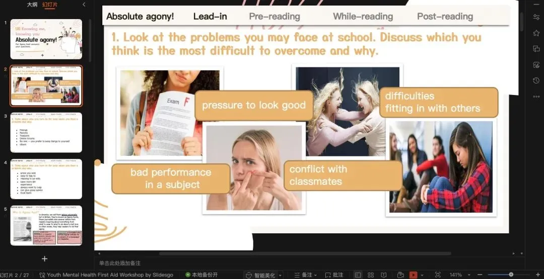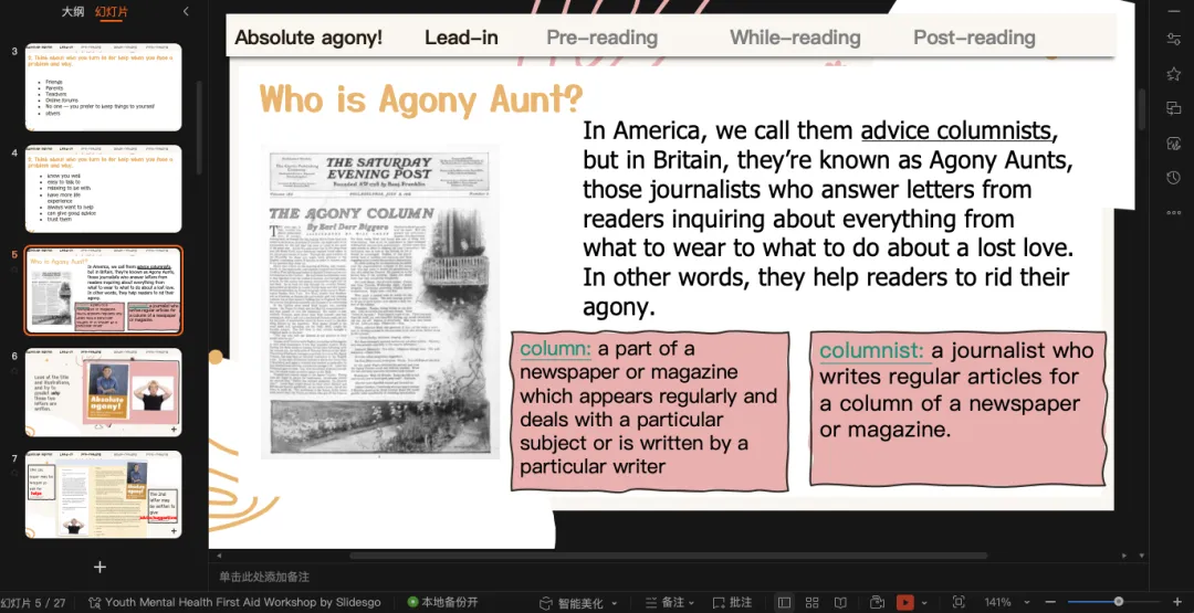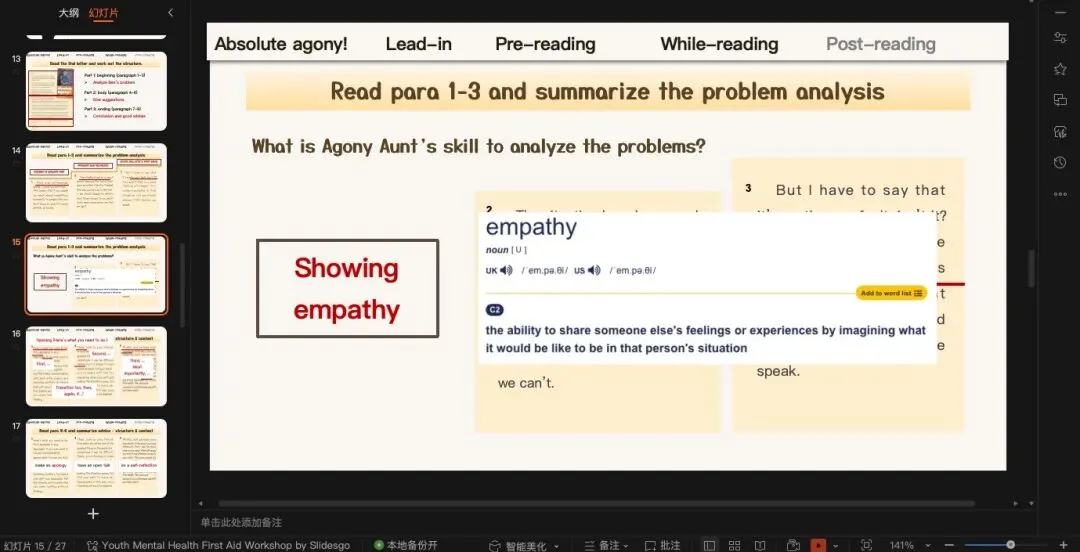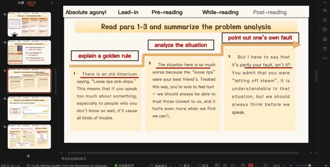 回信的结构稍微变了一点,并不是直接回复advice,一点,两点...而是多了一个problem analysis的部分,然后再说建议。回信部分是这篇文章的重点,从结构上可以处理problem analysis和advice两部分内容。分析的特点?就是Agony Aunt展现出的同理心。这篇文章因为课文本身的内容不是很难,所以我在读后设计放了两部分内容: