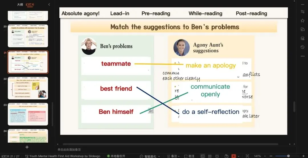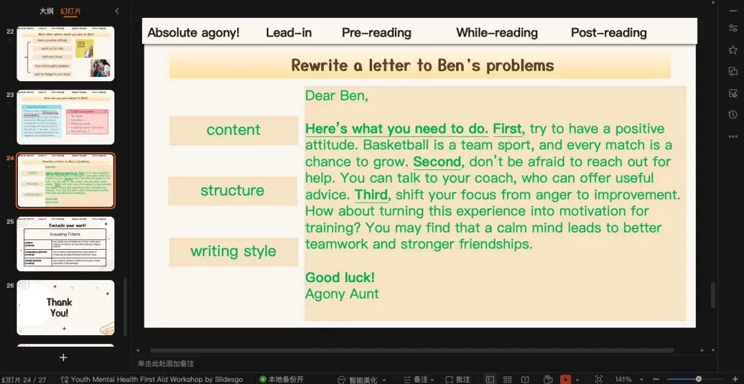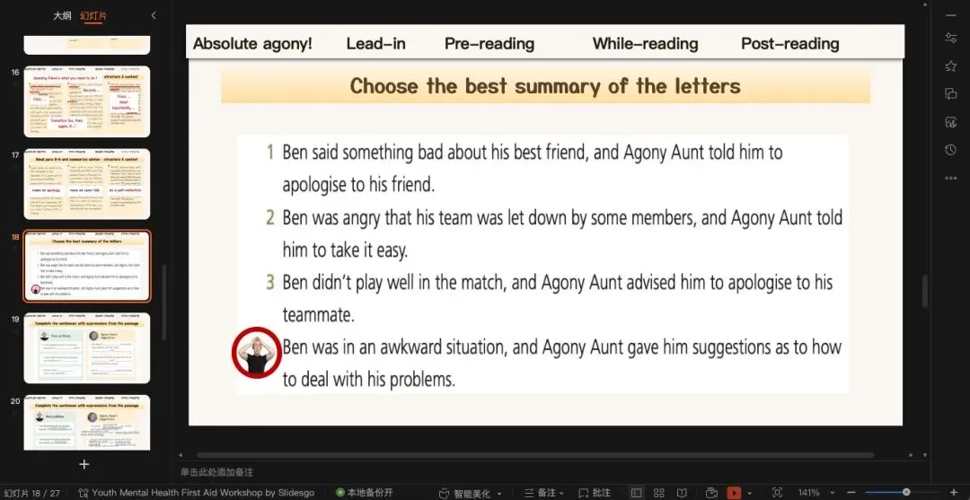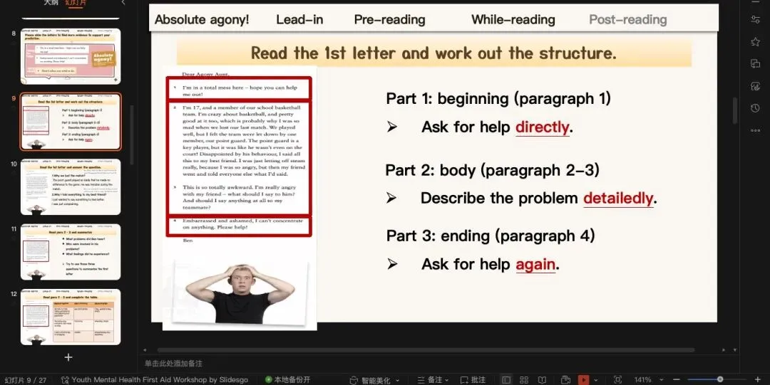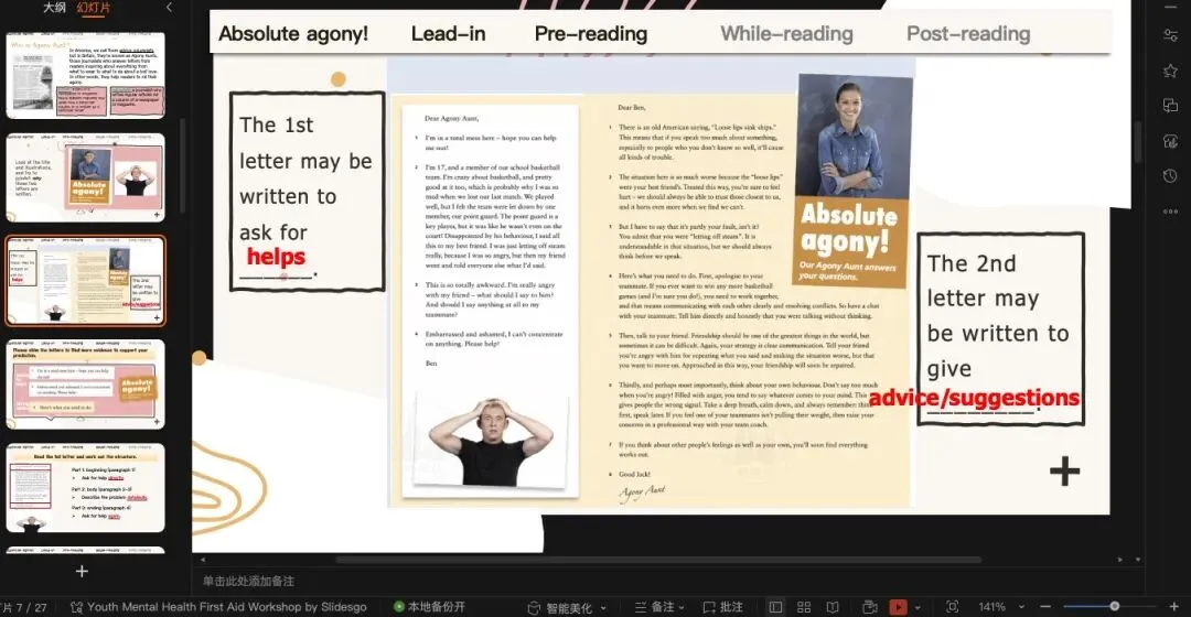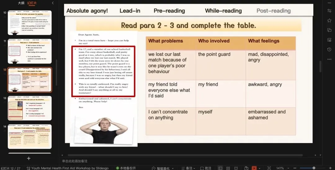 既然有prediction,就一定有check prediction沿用上一个环节的预测,那我们引导学生快速浏览全文确定两封信的写作目的(也就是一个asking for help,另一个是offering advice)没有像time for change那篇横向同时处理两封信,这篇课文的两封信我们还是一个一个解决完。这篇文章文结构非常的清晰简单,应用文无非就是opening-body-ending。这里主要着重处理Ben的问题到底是什么?一方面可以借助教材上的习题,从target方面入手,让学生从“自身、朋友、队友”三方面总结问题;另一方面也可以引导学生注意问题背后引发的情绪变化。(原创ppt)