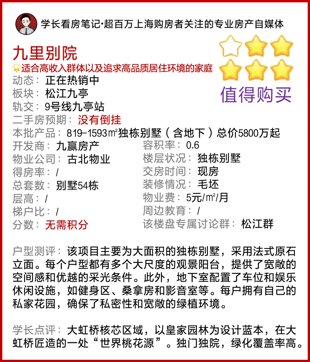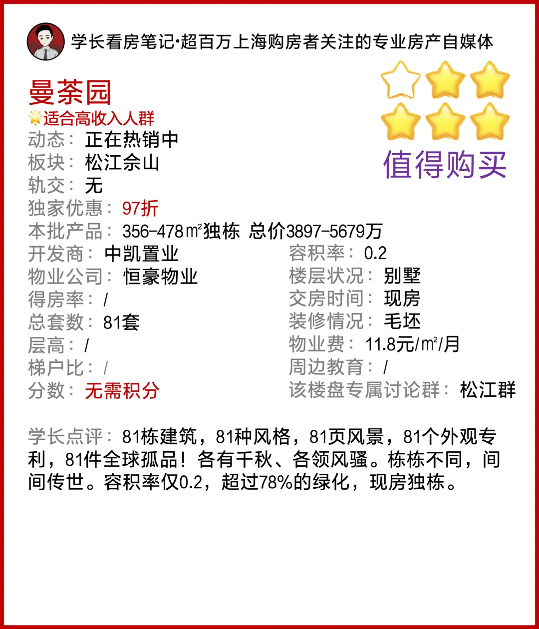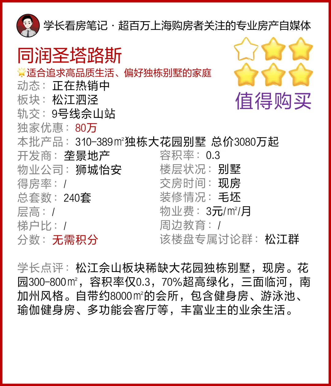 最新消息,佘山「同润圣塔路斯」建面约310-389㎡大花园独栋,总价约3080万!