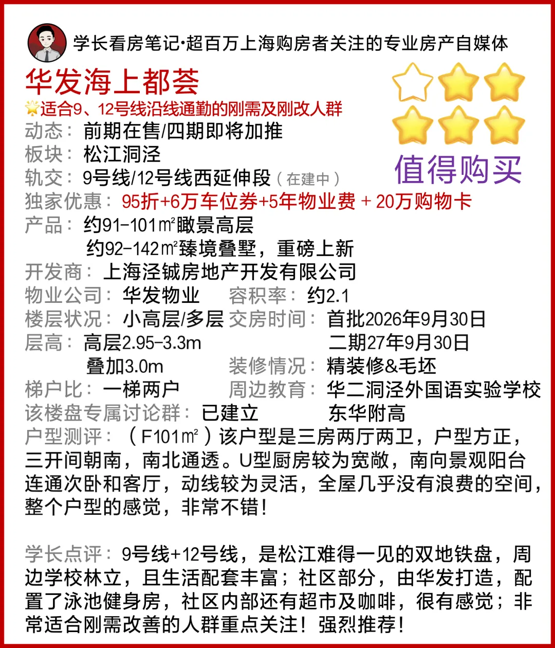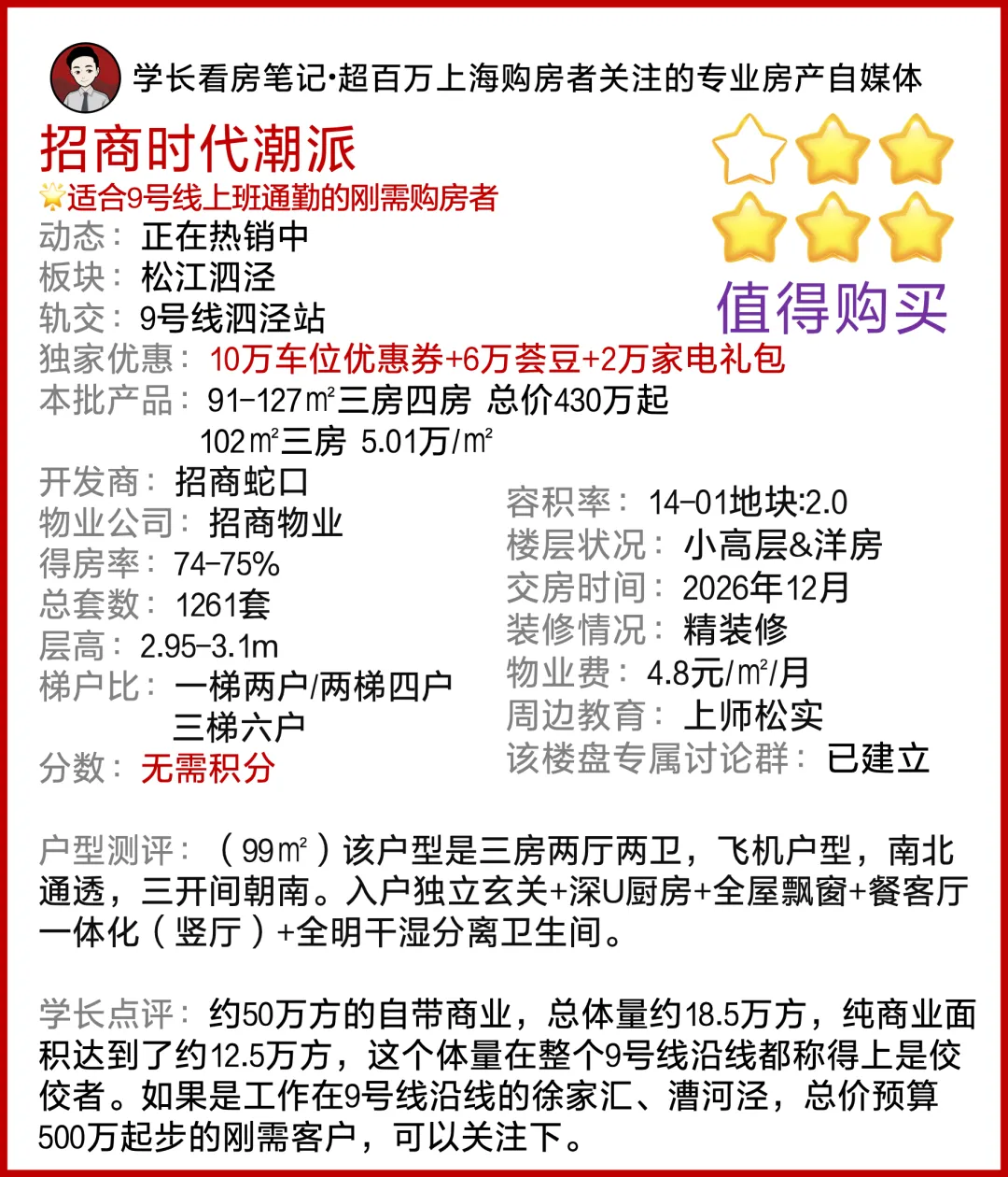 松江泗泾9号线TOD神盘「招商时代潮派东屿」在售中!推出建面约102-128㎡三房四房,均价5.27万/㎡!
