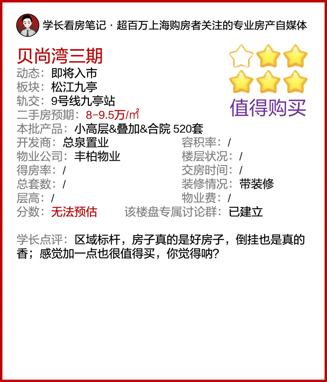 最新消息,松江九亭「贝尚湾」三期即将入市!预计推出小高层&叠加&合院,共计520套!本课件为人工统计,如有错误,欢迎留言指正,当然,如果大家对课件的内容提升,有任何建议,或者,需要加入「松江买房讨论群」,可以扫描下方二维码,诚挚感谢!