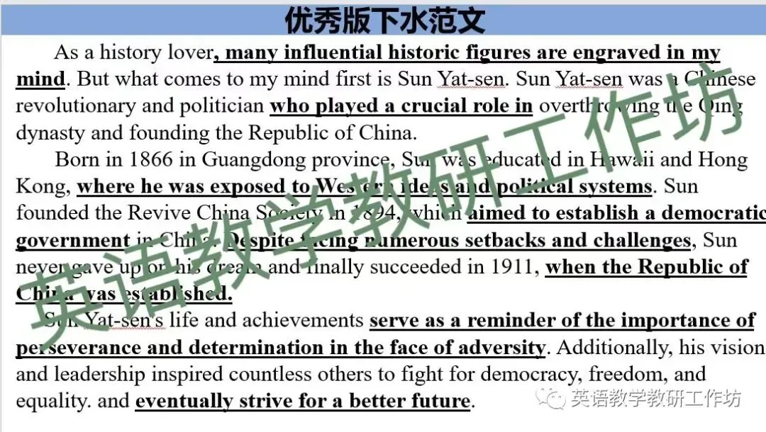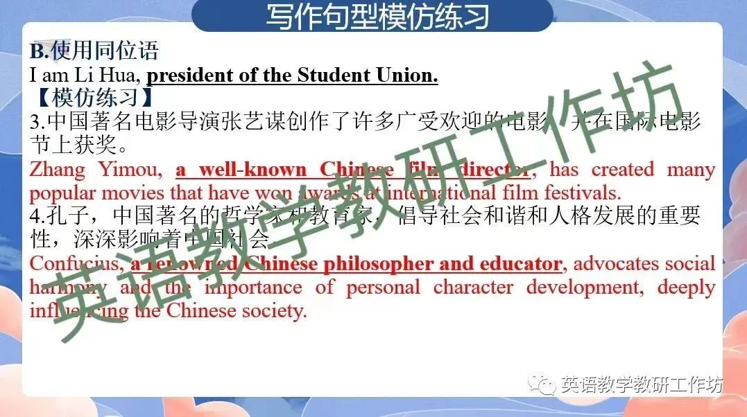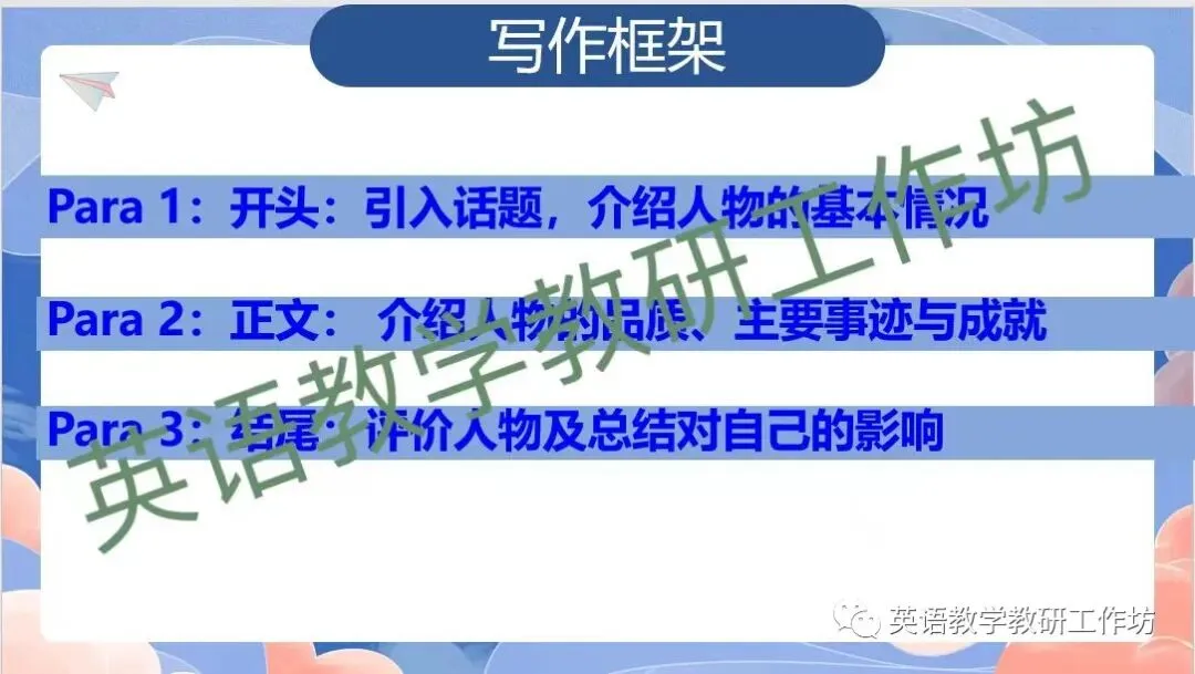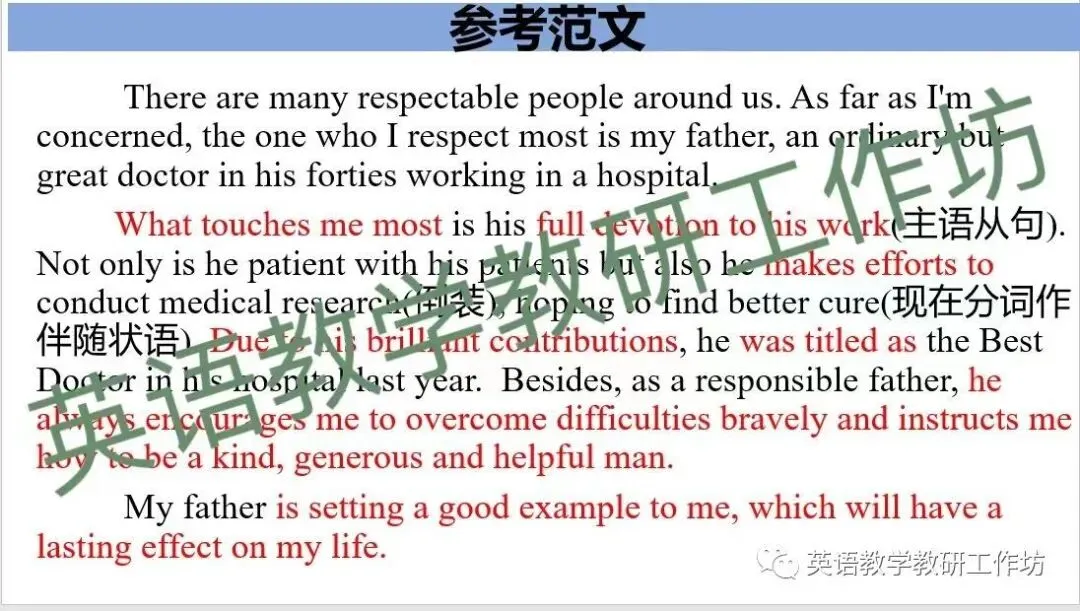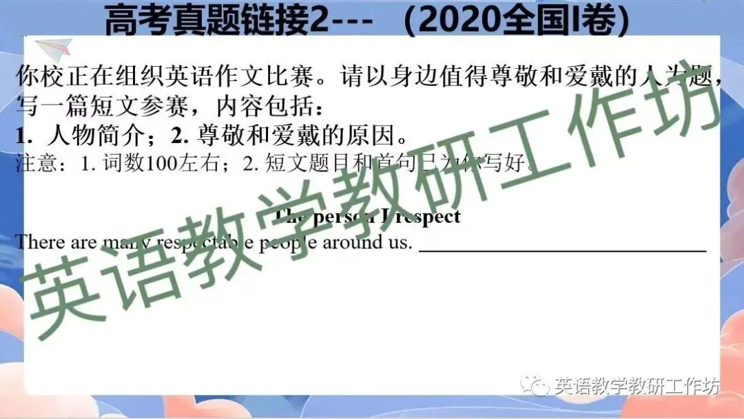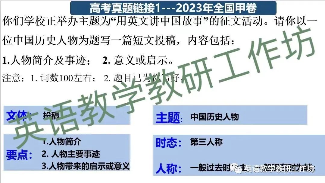 值得尊敬和爱戴的人",2023年全国甲卷考了“介绍中国历史人物”。本资料立足人教版选择性必修一主要内容,检测学生所学所思。以人物介绍为语料,从高级句式的模仿应用出发,引导学生步步掌握非谓语动词,同位语,定语从句,名词性从句及倒装句在人物类写作中的应用。同时本文补充了不同教材里的人物介绍语料,帮助学生学以致用,把课本所学知识迁移到写作中。
