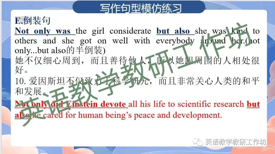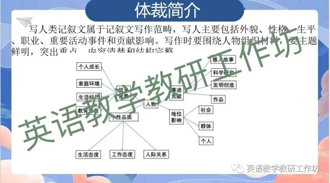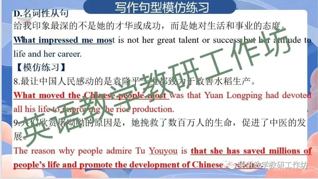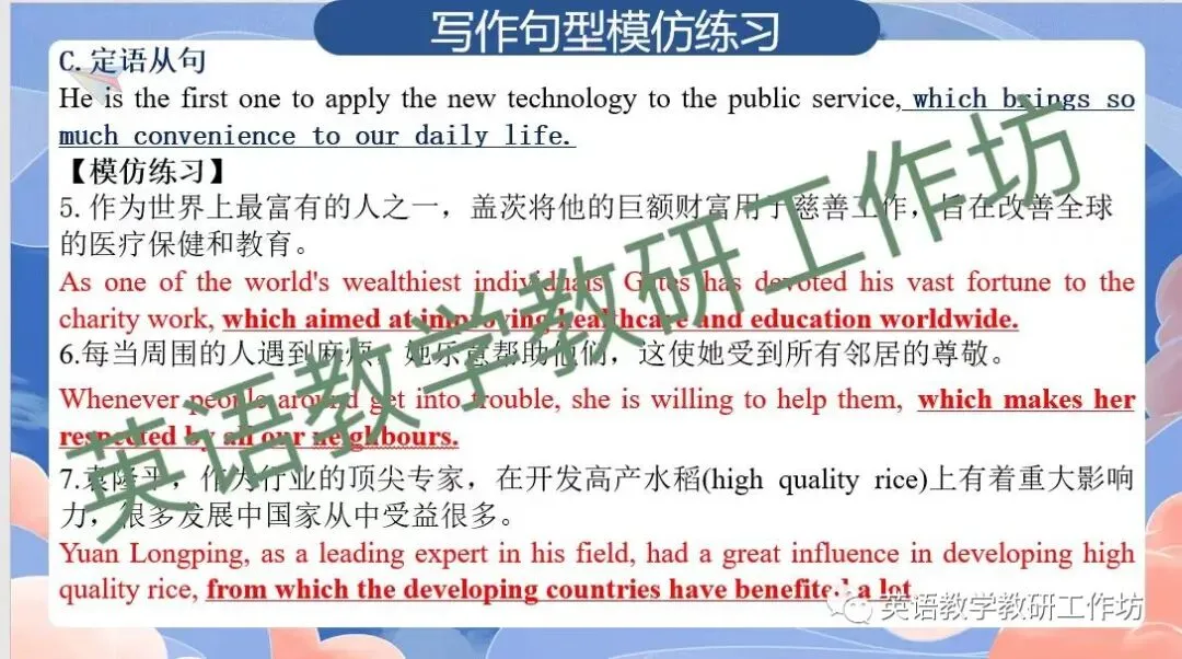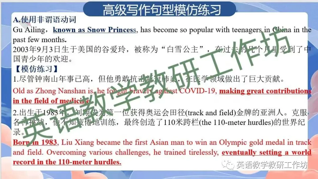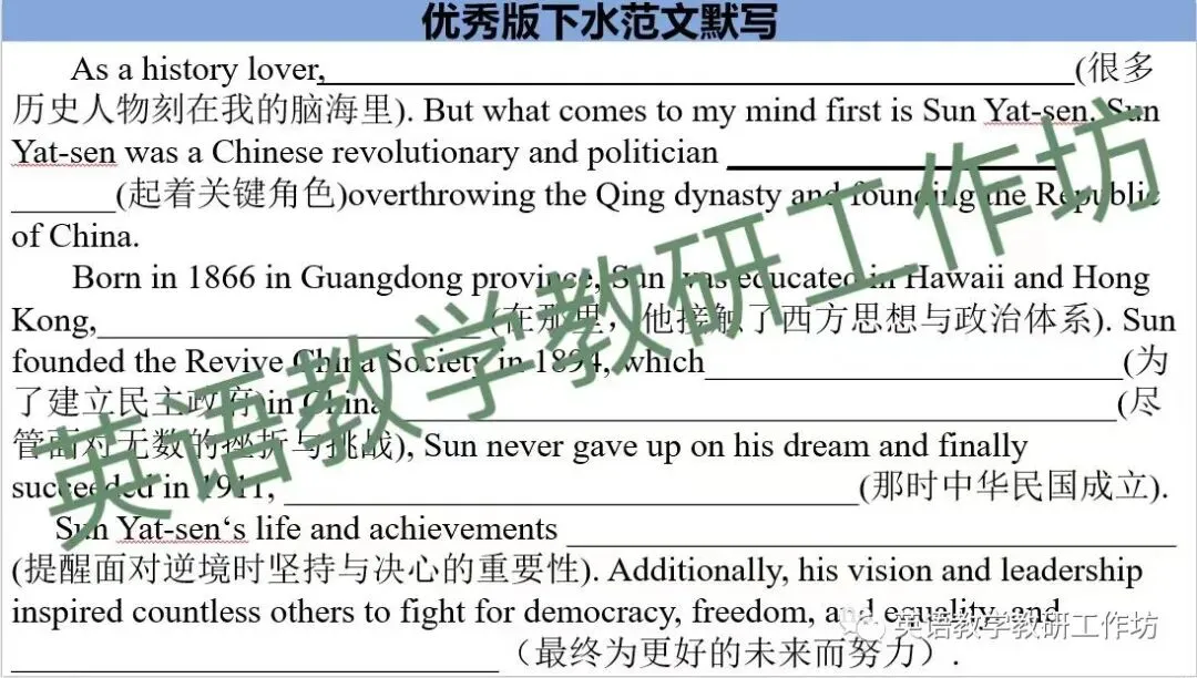 值得尊敬和爱戴的人",2023年全国甲卷考了“介绍中国历史人物”。本资料立足人教版选择性必修一主要内容,检测学生所学所思。以人物介绍为语料,从高级句式的模仿应用出发,引导学生步步掌握非谓语动词,同位语,定语从句,名词性从句及倒装句在人物类写作中的应用。同时本文补充了不同教材里的人物介绍语料,帮助学生学以致用,把课本所学知识迁移到写作中。