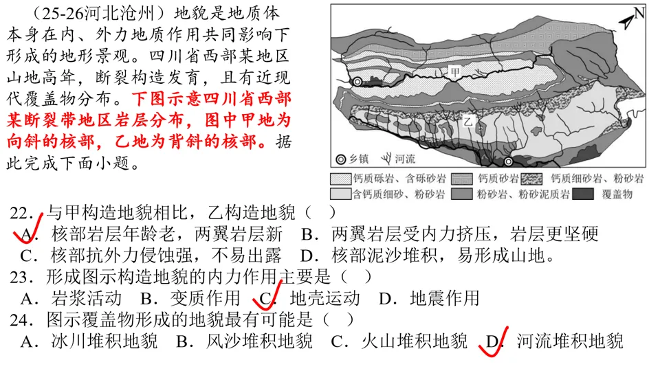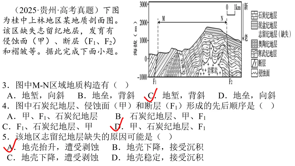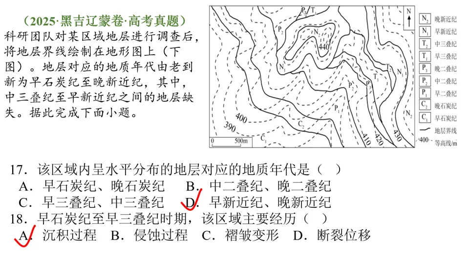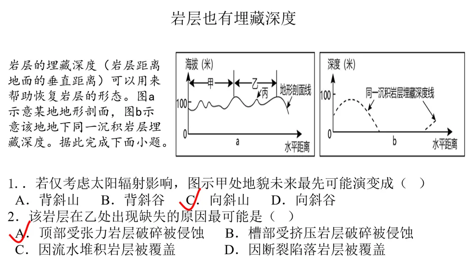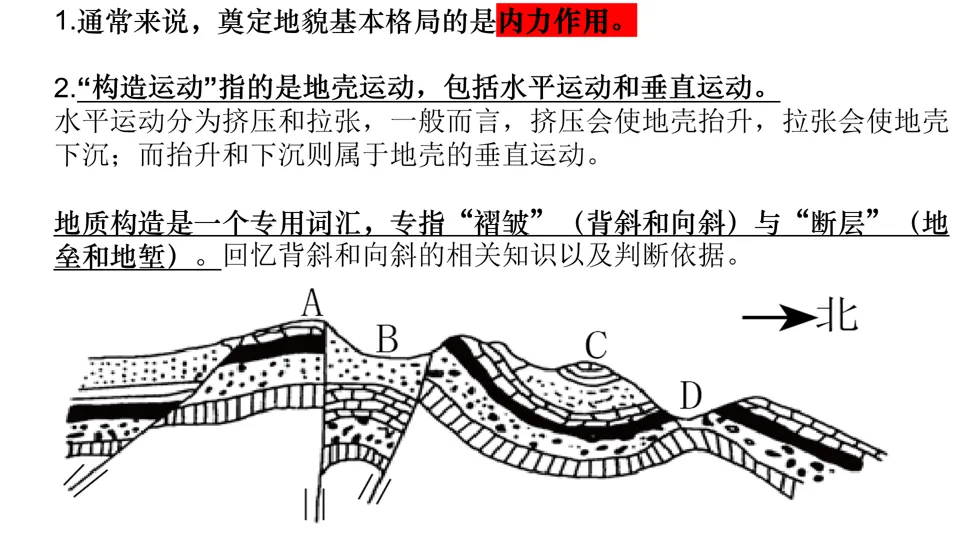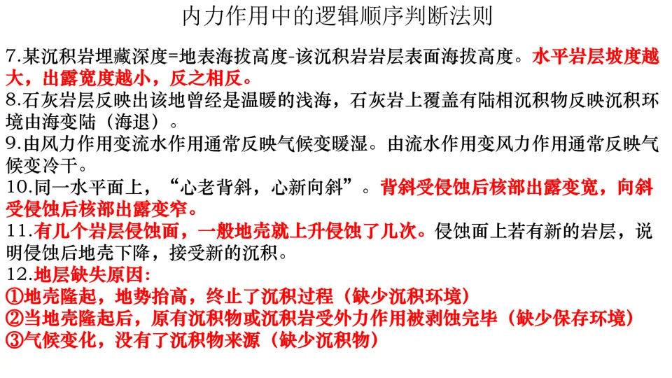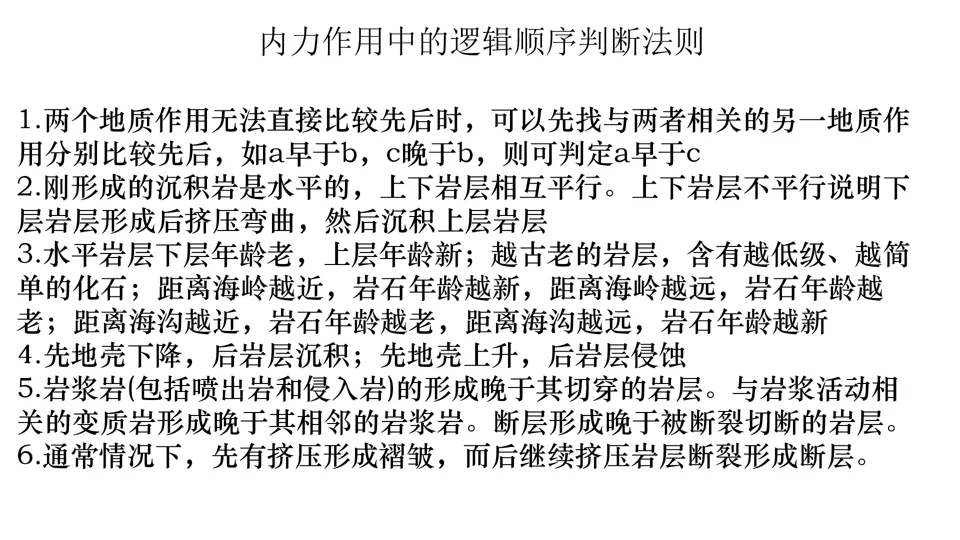 高屋建瓴,条分缕析,对各种内力作用做了深刻的点拨,涉及“岩层埋藏深度”、“背斜和向斜遭遇断层后,上下盘不同的侵蚀状况”等。并结合经典试题,对内力作用的逻辑顺序做出了详尽的分析。