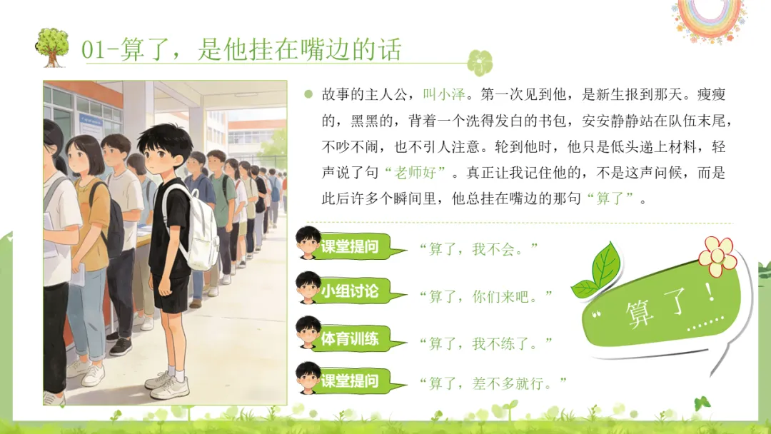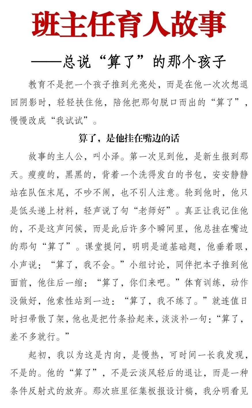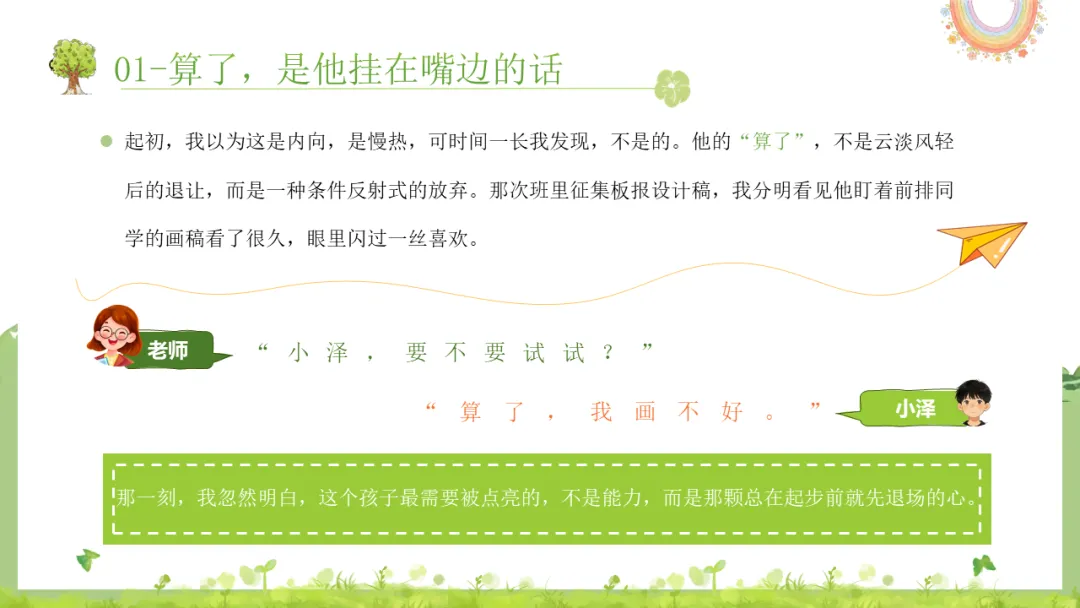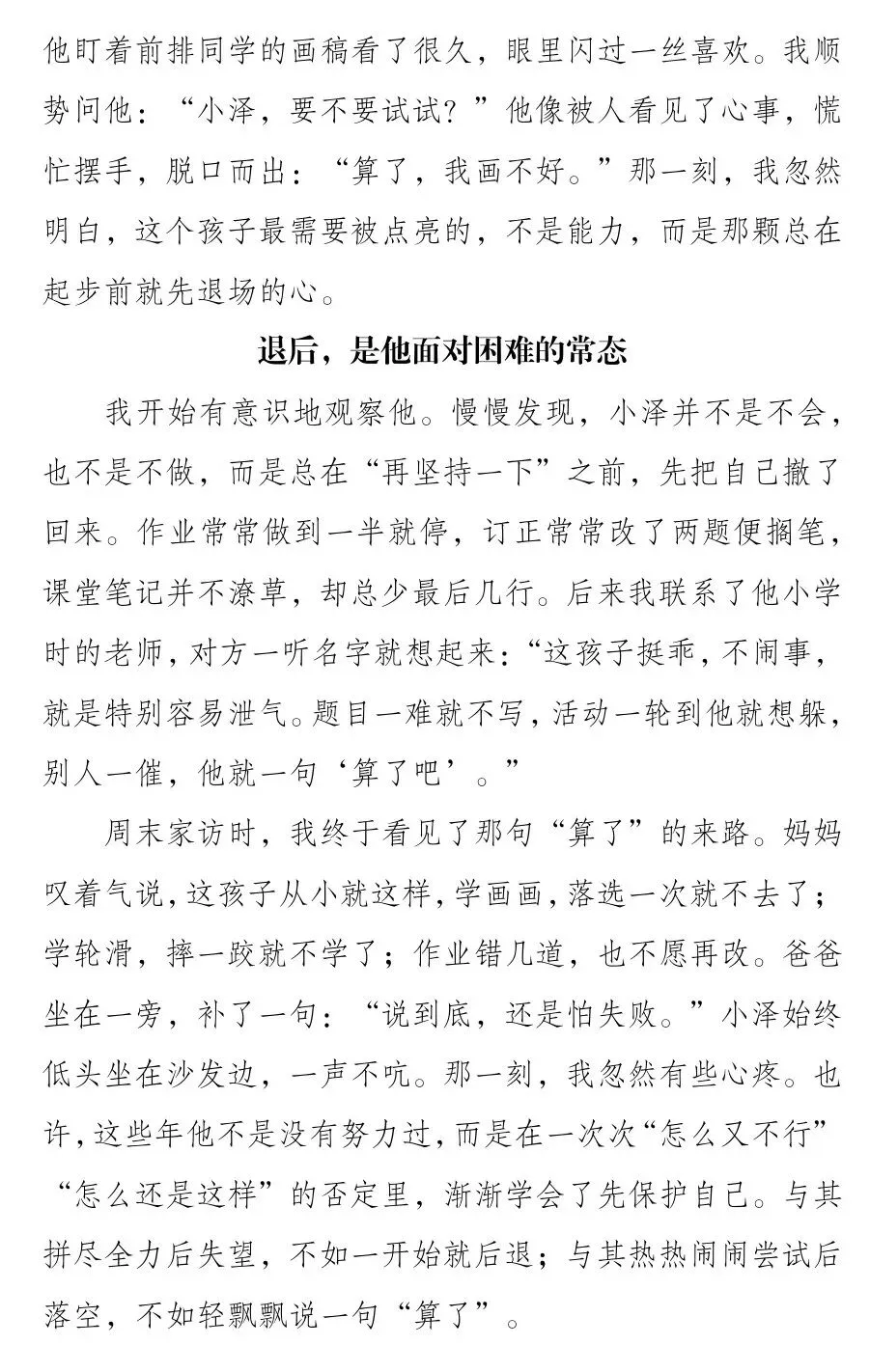 起初,我以为这是内向,是慢热。可时间一长我发现,不是的。他的“算了”,不是云淡风轻后的退让,而是一种条件反射式的放弃。他分明盯着前排同学的画稿看了很久,眼里闪过一丝喜欢;他分明作业做到一半,思路还在,却先把笔放下了。