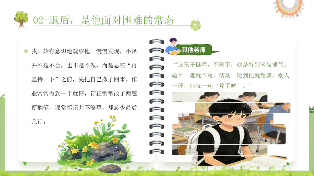 我开始有意识地观察他。慢慢发现,小泽并不是不会,也不是不做,而是总在“再坚持一下”之前,先把自己撤了回来。作业常常做到一半就停,订正常常改了两题便搁笔,课堂笔记并不潦草,却总少最后几行。