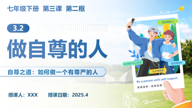 本期【会员群】更新课件3.2《做自尊的人》,本次课件内容是2024秋统编版道德与法治七年级下册第一单元第三课第二框,共15页,建议教学时长为1课时。