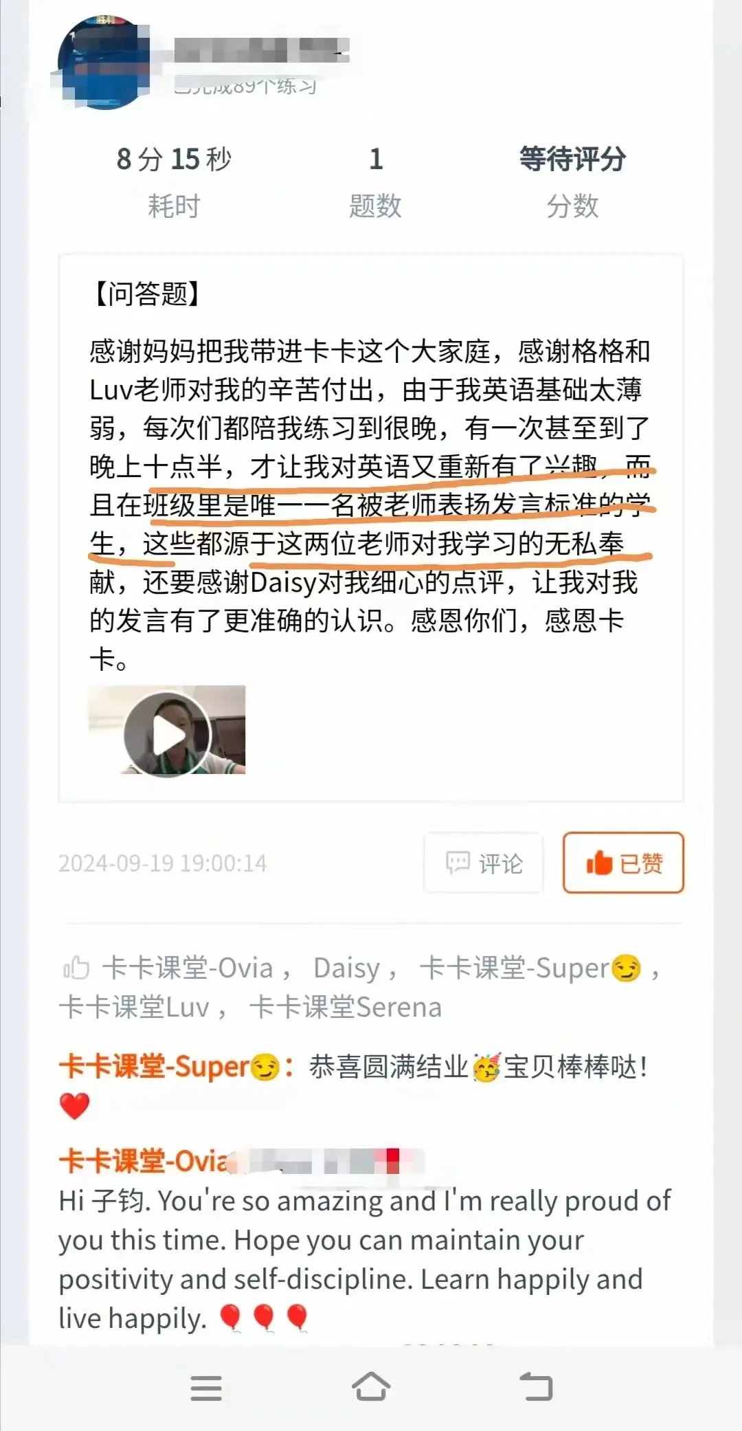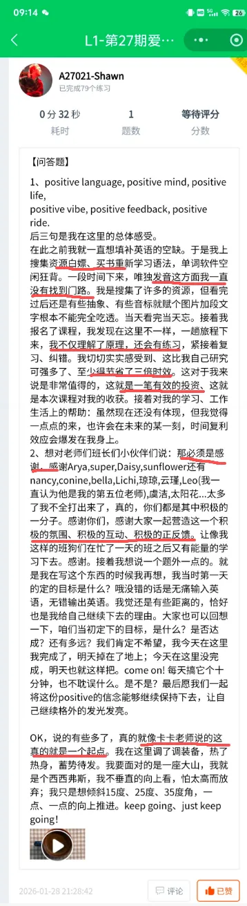 每周的作业中,小伙伴们都会用视频记录自己在英语上的收获;