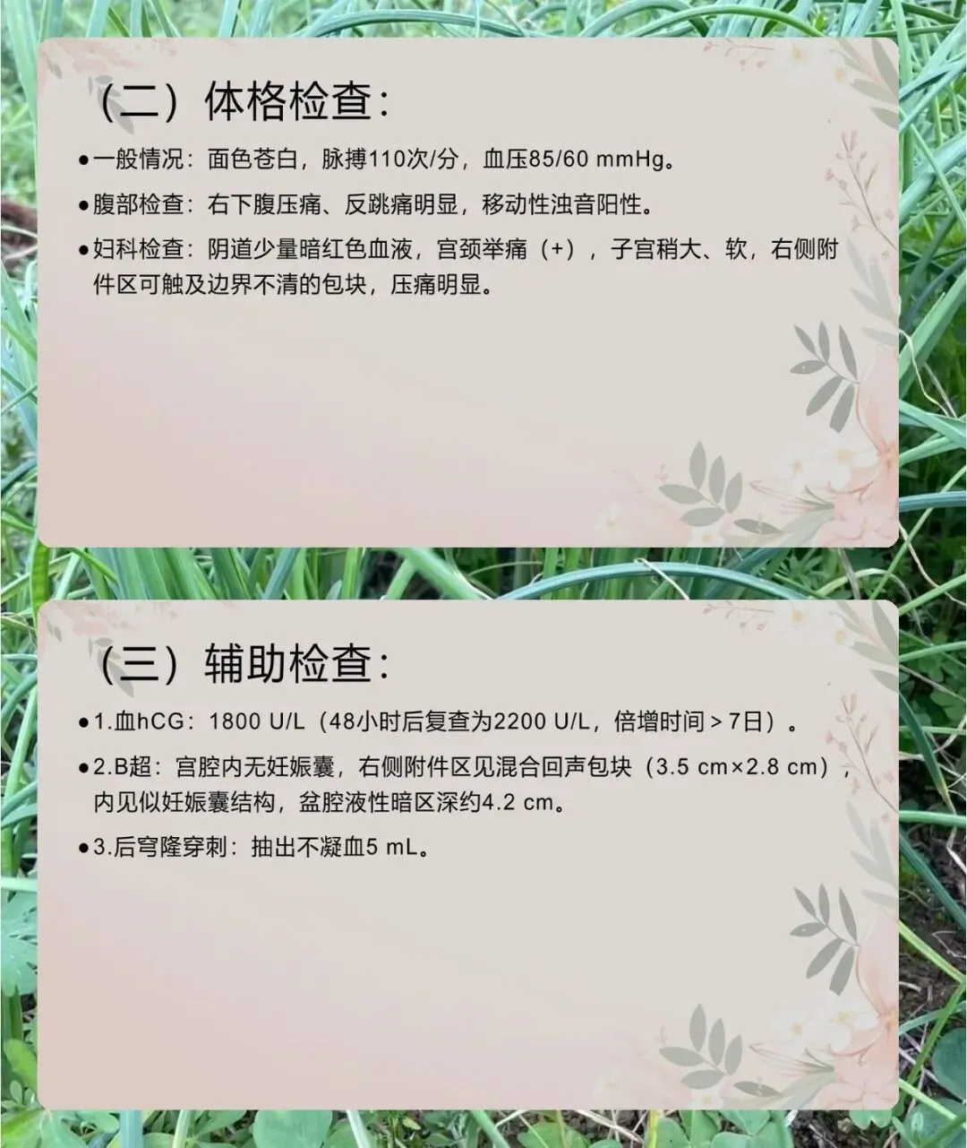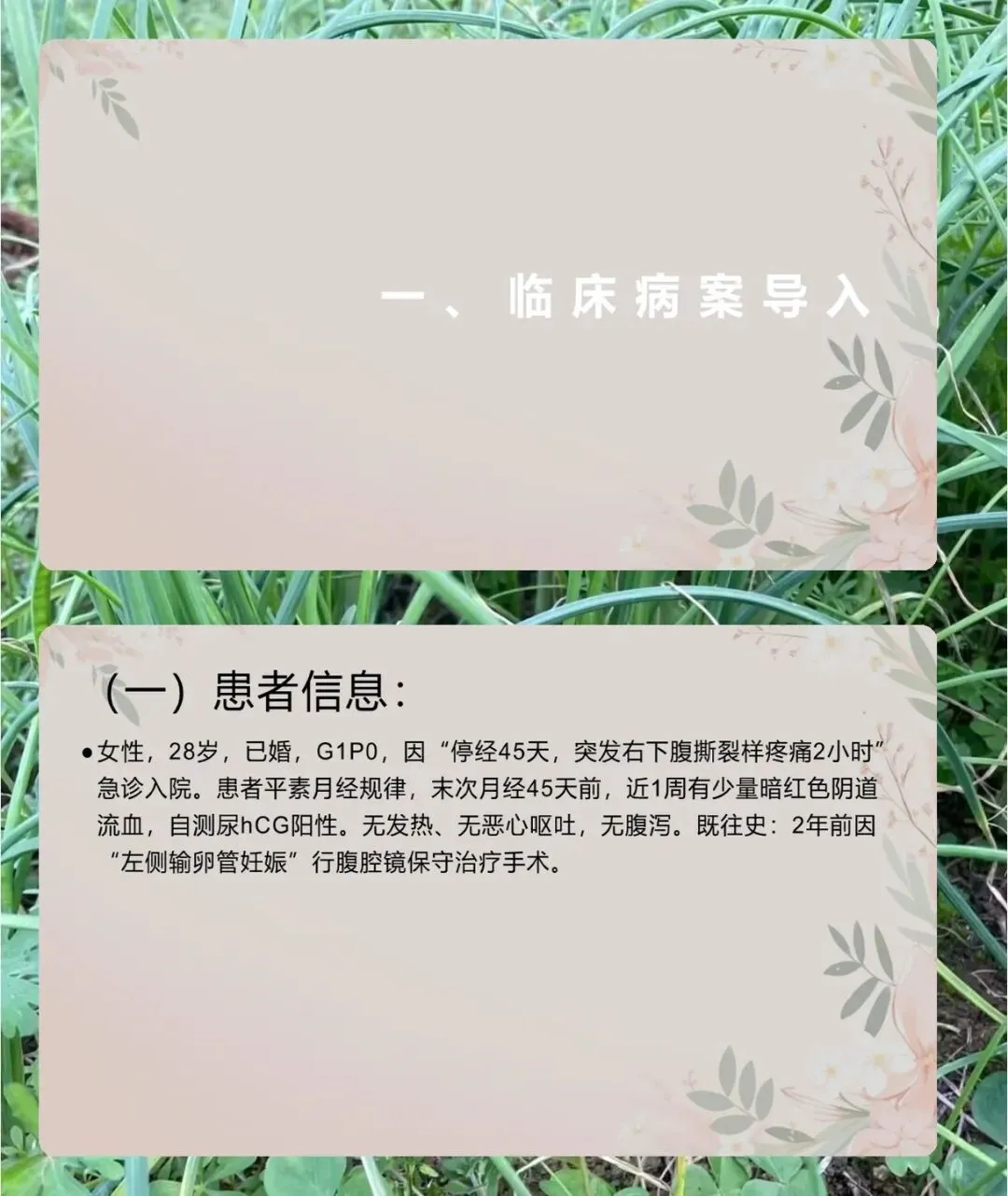 各位同事,今天咱们一起学习异位妊娠相关知识,先从一个临床病案开始看。28 岁已婚女性,G1P0,停经 45 天,突发右下腹撕裂样疼痛 2 小时急诊入院,平时月经规律,近 1 周少量暗红阴道流血,尿 hCG 阳性,2 年前有左侧输卵管妊娠腹腔镜保守治疗史。体格检查见面色苍白,脉搏 110 次 / 分,血压 85/60mmHg,右下腹压痛反跳痛,移动性浊音阳性,妇科检查宫颈举痛,右侧附件有压痛包块。辅助检查血 hCG1800U/L,48 小时后 2200U/L,倍增时间超 7 天,B 超宫腔无孕囊,右侧附件有混合回声包块,盆腔有液性暗区,后穹隆穿刺抽出不凝血 5mL,大家结合这些信息思考相关问题,咱们后面再解答。