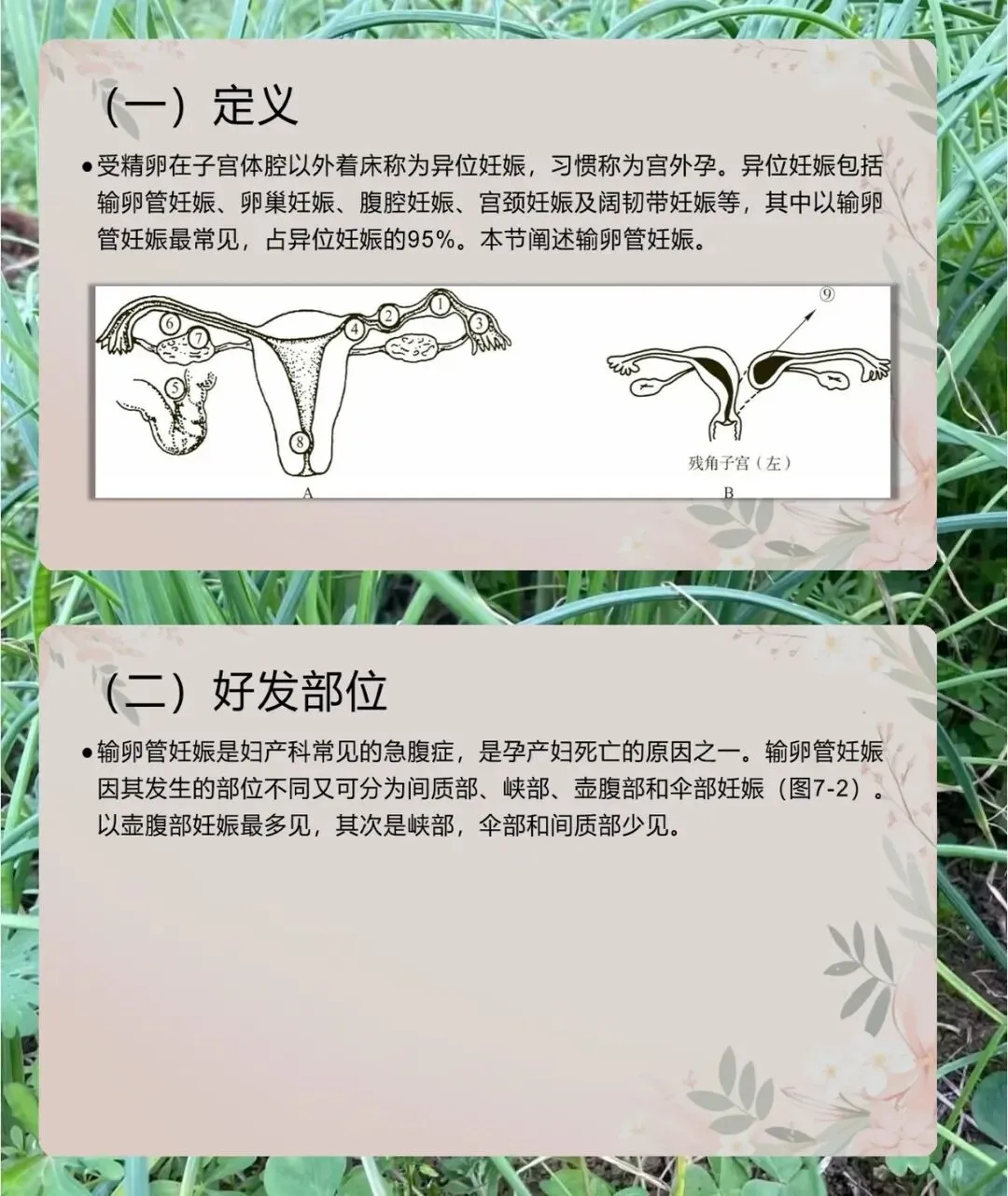 接下来讲异位妊娠的概述,受精卵在子宫体腔以外着床就是异位妊娠,也叫宫外孕,输卵管妊娠占 95%,是妇产科常见急腹症,还会导致孕产妇死亡。输卵管妊娠好发部位里,壶腹部最多,其次峡部,伞部和间质部比较少见。