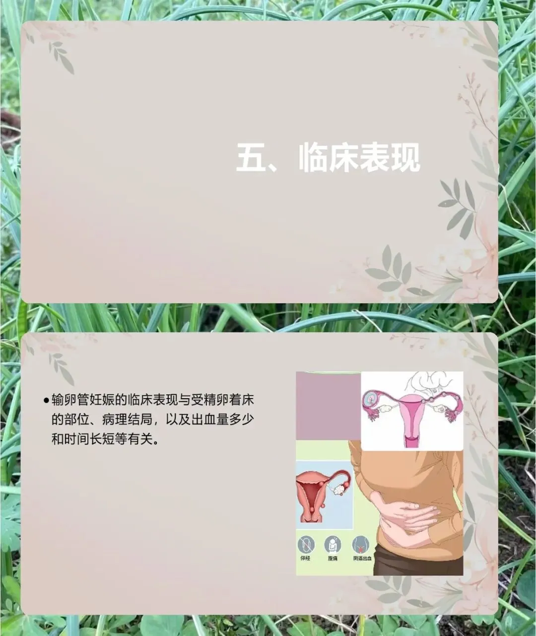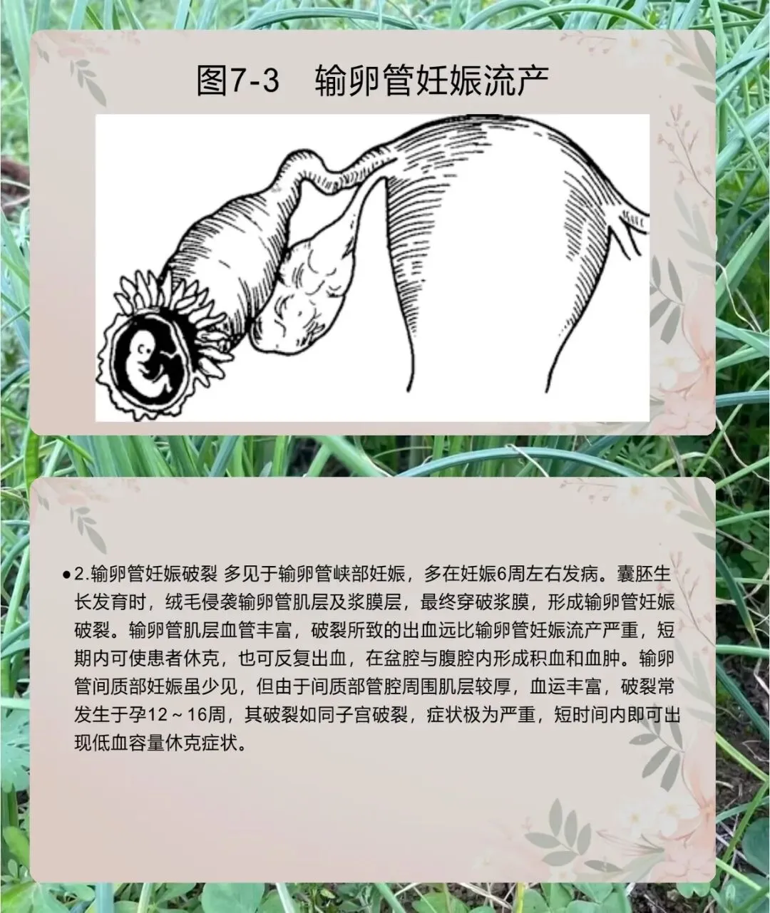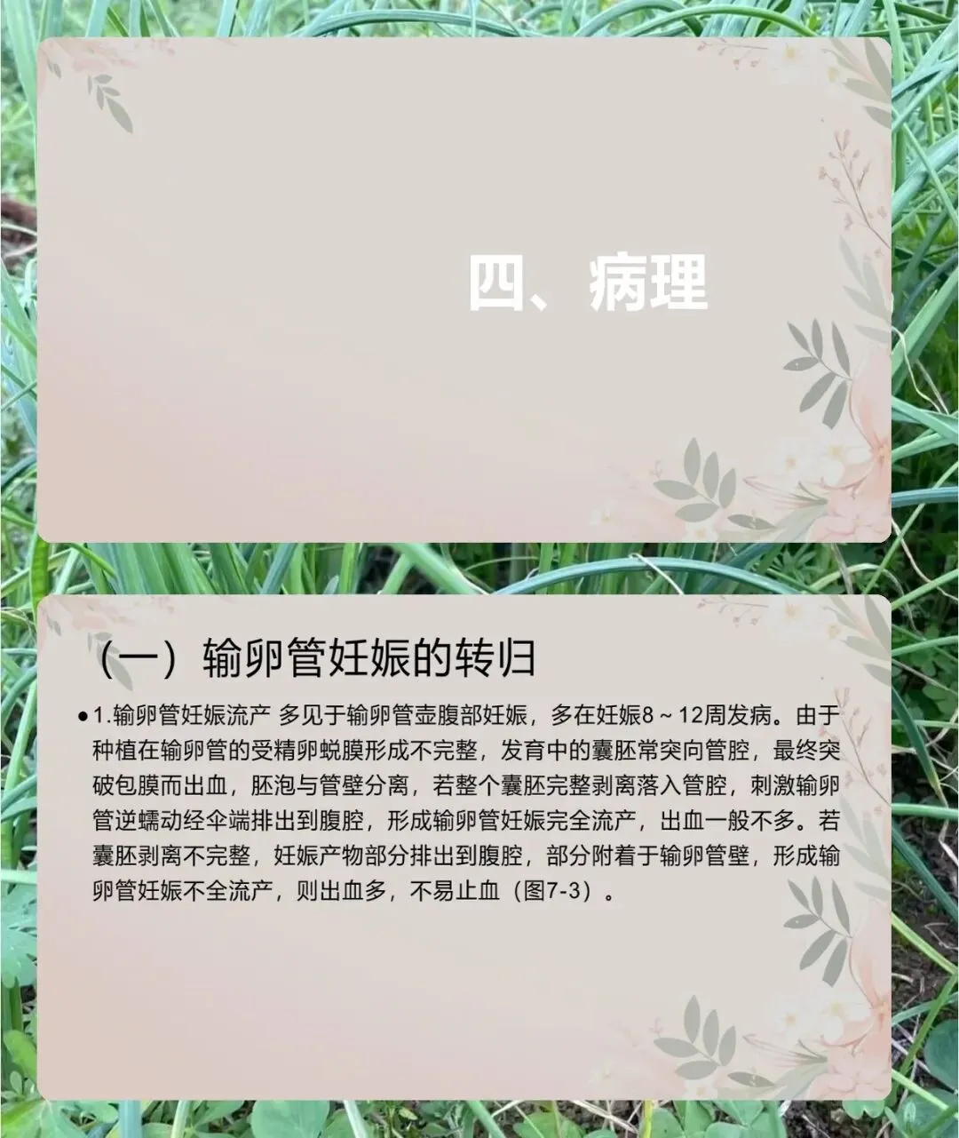 病理方面,输卵管妊娠有四种转归,流产多见于壶腹部,8-12 周发病,分完全和不全流产,不全流产出血更多。破裂多见于峡部,6 周左右发病,间质部破裂虽少见但症状严重,易致休克。还有陈旧性宫外孕和继发性腹腔妊娠。同时,异位妊娠会让子宫增大变软,子宫内膜出现蜕膜反应,胚胎死亡后会有蜕膜剥离导致的阴道流血。