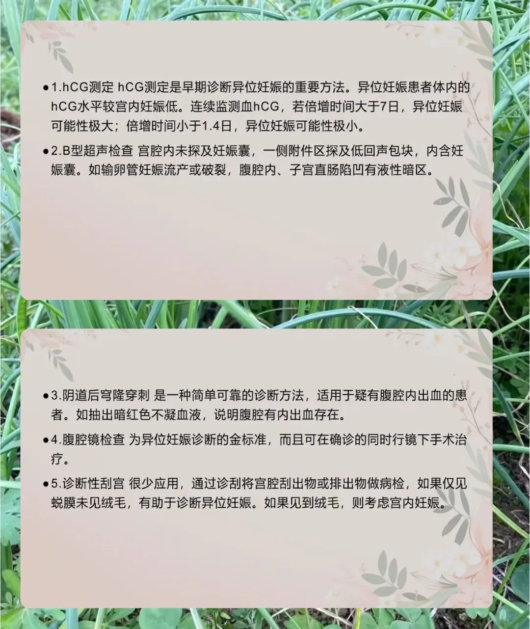 诊断的话,典型症状体征不难判断,不典型的要靠辅助检查,血 hCG 测定是早期重要方法,异位妊娠 hCG 水平低,倍增时间超 7 天可能性大。B 超看宫腔内有无孕囊,后穹隆穿刺抽出不凝血提示腹腔内出血,腹腔镜是诊断金标准,还能同时手术。