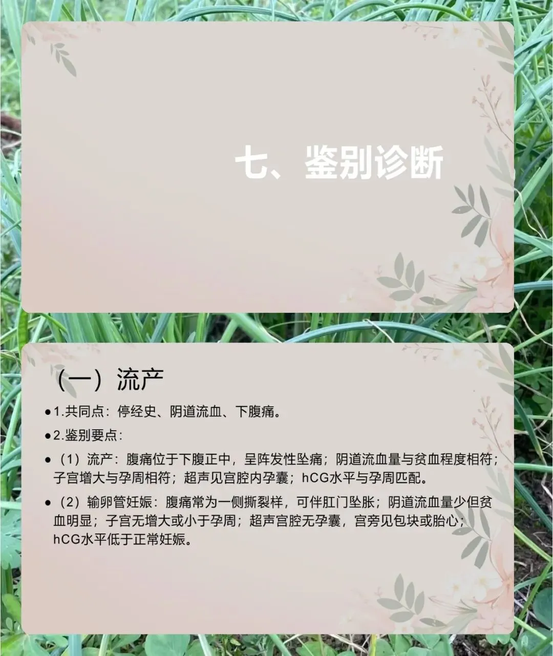 鉴别诊断要区分流产、急性盆腔炎、急性阑尾炎、卵巢囊肿蒂扭转、黄体破裂,核心看停经史、hCG 结果,还有体征和超声表现。