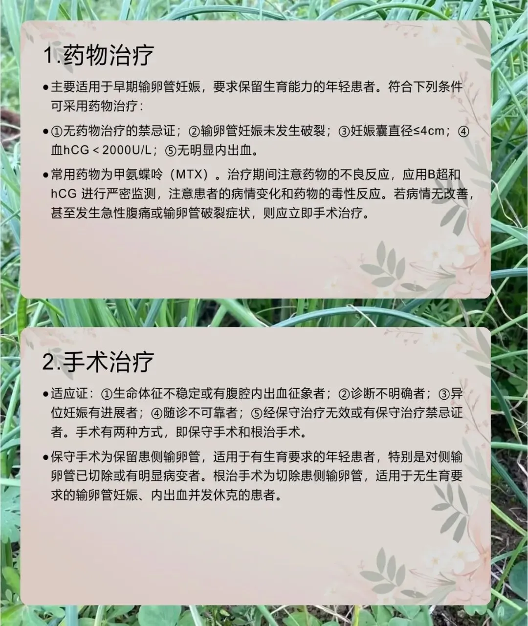 治疗分药物和手术,药物治疗用甲氨蝶呤,有严格的适用条件,必须无破裂、无明显内出血等。手术治疗适用于生命体征不稳定、有内出血的患者,分保守和根治手术,保守手术保留输卵管,根治手术切除患侧输卵管。