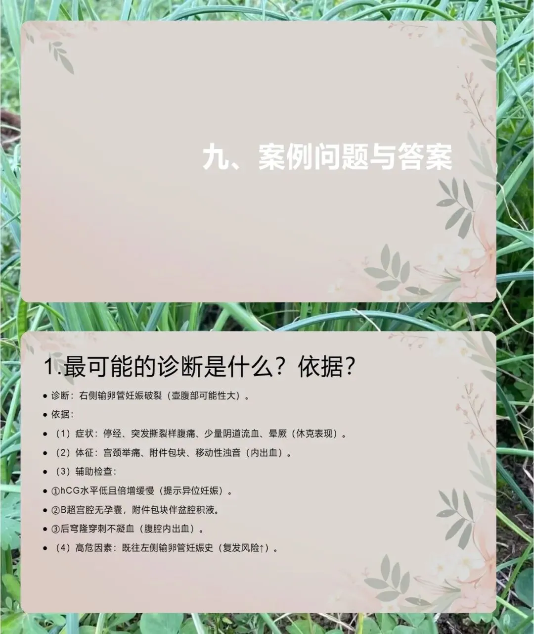 今天的异位妊娠知识就讲到这里,相关内容大家结合临床案例再巩固,有问题咱们后续再交流。