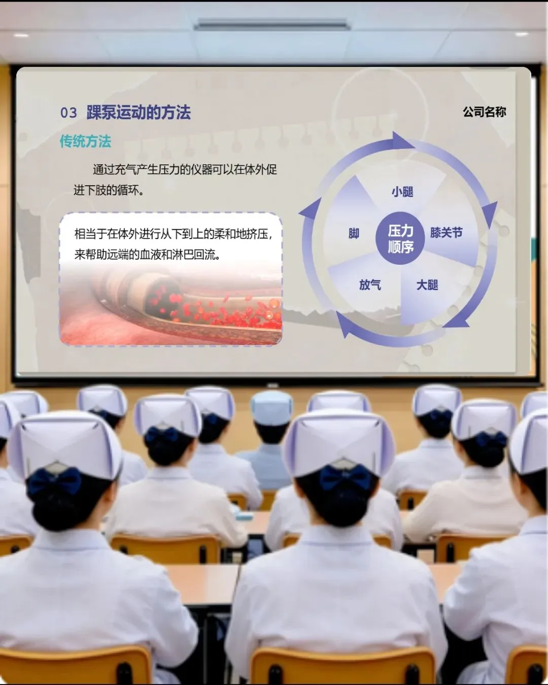 接下来讲踝泵运动怎么做。以前有用仪器充气压迫促进循环的,但是被动运动效果不好,不练肌肉,疼的时候不能用,打石膏也用不了。踝泵运动靠肌肉收缩挤血管,效果更好。