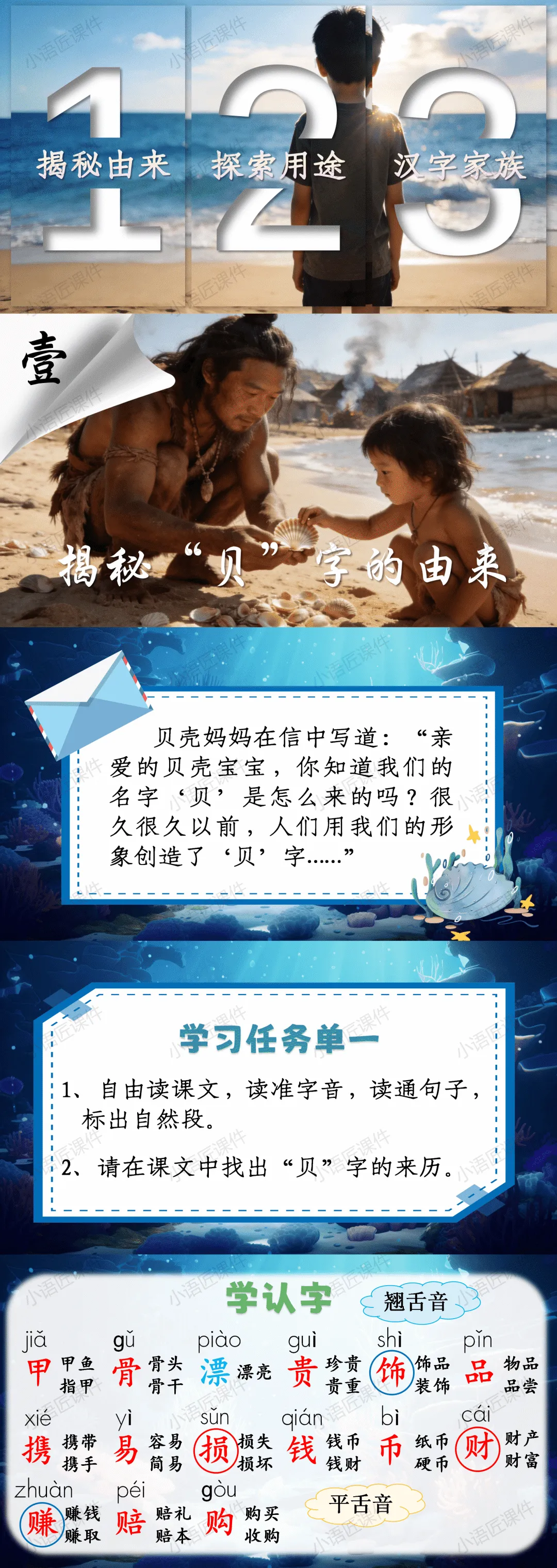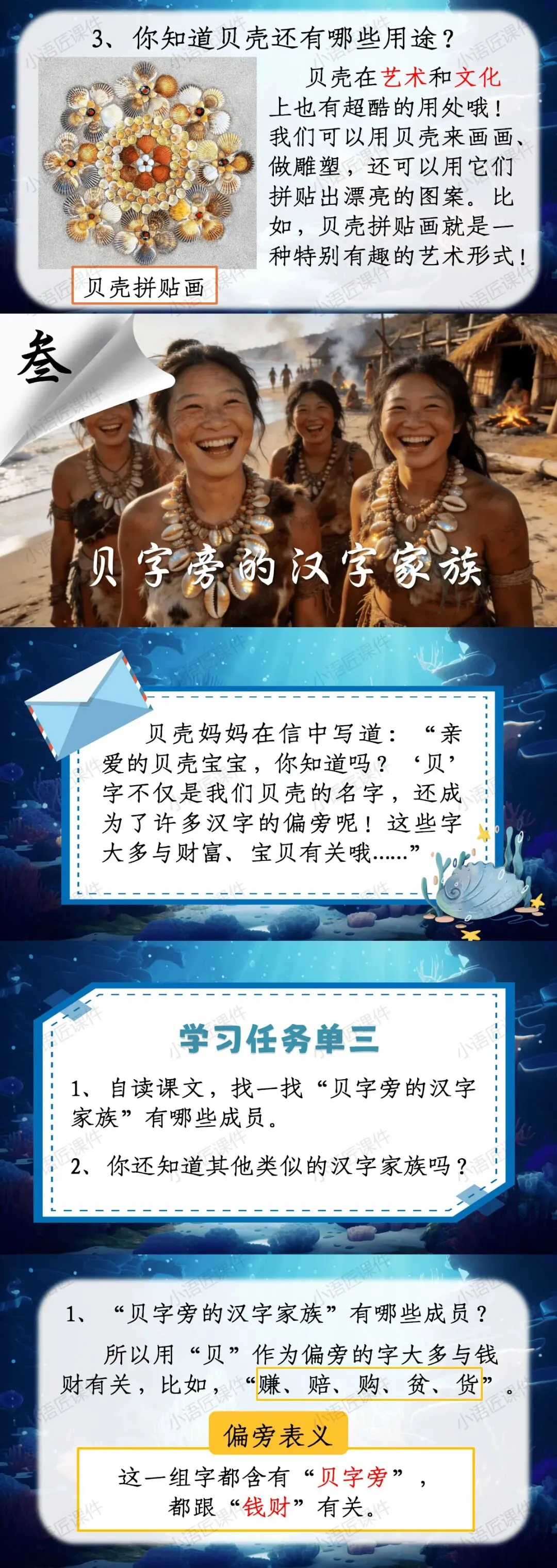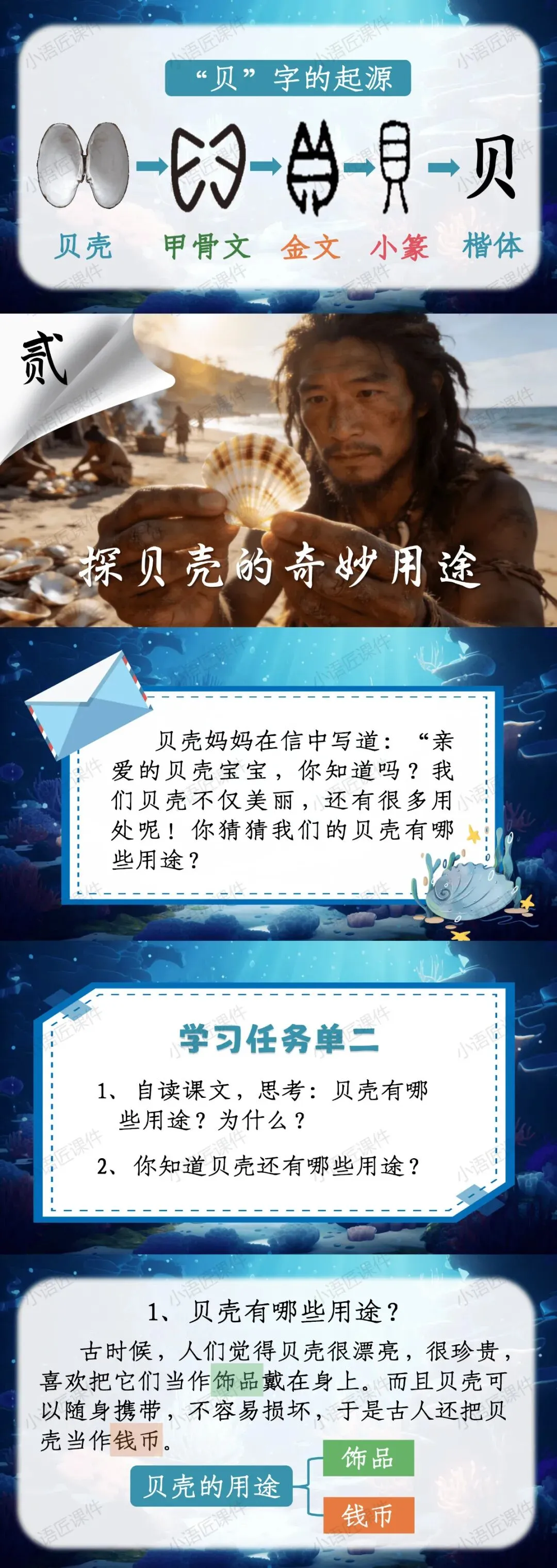 【二下课件】情景设置:“贝壳妈妈给小贝壳写的一封信”——识字《“贝”的故事》(课件+教学设计!)