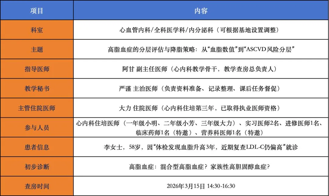说明:本阶段仅做查房启动和注意事项说明。预习任务已前置完成,此处不再提问。投影展示:血脂代谢示意图、ASCVD危险分层表、他汀强度分级、降脂药物作用靶点图。“阿甘老师,各位学员,本次查房签到已完成。预习材料3天前已推送,学员书面作业已收齐汇总。”“各位同事,下午好。今天我们聚焦心血管内科最基础、也是最容易被低估的疾病——高脂血症。说它基础,因为每个心内科医生每天都在开他汀;说它被低估,因为很多医生只会看‘箭头’,不会算‘风险’。今天的病例很有教学价值:58岁女性,体检发现血脂升高3年,LDL-C一直在3.5-4.0徘徊。问三个问题:①她需要吃药吗?②吃什么药?③吃到多少才算达标?这三个问题答对了,血脂管理就入门了。本次教学查房,我们围绕高脂血症诊疗的五大核心能力展开:1. 血脂解读能力:看懂LDL-C、HDL-C、TG、非HDL-C、Lp(a)2. 风险分层能力:根据最新指南进行ASCVD危险分层 5. 医患沟通能力:用通俗语言解释‘为什么要长期吃药’2. 重点询问饮食运动习惯、既往病史、家族史、用药史好,没有问题的话,我们5分钟后进入诊室。请大力医生准备汇报。”请大家讨论?????欢迎各位同仁提出您的建议和想法,指正不足。