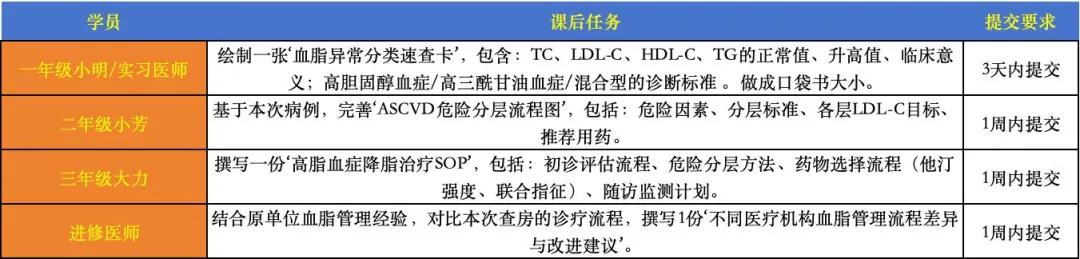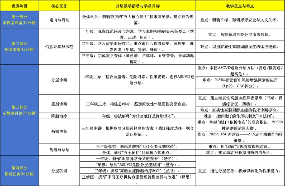 “高脂血症是心血管医生的‘基本功’。今天我们从一例典型病例入手,走完了从风险评估到药物决策的全流程。希望大家记住:血脂管理不是‘看箭头’,而是‘算风险’。全体学员:复习本次查房涉及的英文专业词汇,下周晨间报告随机抽查。血脂指标:Total Cholesterol (TC), LDL-C, HDL-C, Triglycerides (TG), Non-HDL-C, Lipoprotein(a) [Lp(a)]危险分层:ASCVD risk stratification, High-risk, Very high-risk, Extreme high-risk药物:Statin, Ezetimibe, PCSK9 inhibitor, Bempedoic acid, Combination therapy评估工具:CAC score, Dutch Lipid Clinic Criteria, Familial Hypercholesterolemia (FH)(讨论环节注意“留白”,给予学员思考和组织语言的时间。指导教师在提问后,至少等待5-10秒,鼓励学员自主构建答案。)