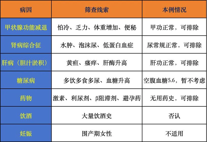 开始前:此步骤核心是问诊示范、重点查体、关键沟通。时间有限,聚焦核心信息,不求面面俱到。指导医师全程观察学员操作,及时纠正易错点;指导医师做好床旁记录,重点记录学员操作亮点与不足。患者李女士精神状态良好,无特殊不适,家属(丈夫)陪同。“阿甘老师、各位医师。患者李女士,58岁,因‘体检发现血脂升高3年,近期复查LDL-C仍偏高’来门诊就诊。目前生命体征:T 36.5℃,P 72次/分,R 16次/分,BP 125/80mmHg。已建立门诊病历,采血结果已出。”患者李女士,58岁,退休教师,因‘体检发现血脂升高3年,近期复查LDL-C仍偏高’就诊。现病史:3年前单位体检发现血脂异常:TC 6.5mmol/L,LDL-C 4.2mmol/L,TG 2.3mmol/L,HDL-C 1.1mmol/L。当时无不适,未规律治疗,仅间断服用过血脂康,未复查。近1年因工作繁忙未复查。1周前社区体检:TC 6.8,LDL-C 4.5,TG 2.1,HDL-C 1.2。患者担心‘血管堵塞’,来院就诊。发病以来,无胸痛、胸闷,无头晕,饮食偏油腻,运动每周1-2次。既往史:否认高血压、糖尿病、冠心病史。否认甲状腺疾病、肾病、肝病史。否认长期服药史(包括激素、利尿剂等)。否认吸烟饮酒。个人史及家族史:绝经5年。父亲65岁因‘心梗’去世,母亲70岁,有高血压。有一兄,50岁,体检血脂高,具体不详。入院查体:生命体征如上。神清,BMI 26.5kg/m²。双眼角膜未见老年环。眼睑、肘部、膝部未见黄色瘤。心肺腹查体未见异常。双侧桡动脉、足背动脉搏动对称有力。血脂四项:TC 6.8,LDL-C 4.5,TG 2.1,HDL-C 1.2,非HDL-C 5.6(设计说明:床旁阶段指导医师不得进行教学点评,此处仅为教案记录。实际查房时,此部分内容移至第三阶段示教室。)“大家注意,大力的汇报抓住了几个关键:1.血脂谱全貌——LDL-C显著升高,TG轻度升高,HDL-C偏低;2.危险因素——绝经后女性,早发冠心病家族史,超重,饮食不健康;3.排除了继发因素——甲功、肝肾功能正常。这些信息是后续危险分层的基础。”“李老师,您好。我是心内科阿甘医生。您的情况我了解了,血脂确实偏高,尤其是‘坏胆固醇’(LDL-C)4.5,属于中高水平。好消息是您目前没有糖尿病、高血压,心电图也正常。但您父亲有心梗史,这是我们需要重视的家族信号。我们会根据您的整体风险,决定是否需要用药、用多强的药。请您放心,血脂管理是个长期过程,我们会和您一起制定一个适合您的方案。”“大力,请你为患者进行一次重点查体。重点关注:①黄色瘤(眼睑、肘部、膝部、跟腱);②角膜老年环;③血管杂音(颈部、腹部);④外周动脉搏动(桡动脉、足背动脉)。操作时注意保护隐私,征得同意。”(设计说明:床旁阶段指导医师不得进行教学点评,此处仅为教案记录。)“大家注意,大力医生演示了高脂血症患者的重点查体流程,操作规范。这里强调几个易错点:①黄色瘤不一定都在眼睑,跟腱、肘部、膝部都要摸;②角膜老年环在<45岁出现才有意义,老年人出现可能只是老年性改变;③血管杂音提示动脉粥样硬化,要听颈动脉、腹主动脉、股动脉。”“李老师,有几个细节对判断病情特别重要,我再跟您确认一下:关于饮食运动:您平时饮食偏油腻是吗?具体爱吃什么?一周运动几次?(评估生活方式干预空间)关于用药史:以前吃过降脂药吗?吃多久?为什么停了?(评估治疗依从性)关于绝经情况:绝经几年了?有没有用激素替代治疗?(评估激素对血脂的影响)关于家族史补充:您父亲心梗是多大岁数?您兄长的血脂具体多少知道吗?(评估遗传背景)”爱吃红烧肉、油炸食品,一周吃三四次;运动少,就周末散散步以前吃过血脂康,吃了两个月,觉得‘没啥感觉’就停了父亲65岁心梗;兄长50岁,体检血脂高,具体不知道(设计说明:床旁阶段指导医师不得进行教学点评,此处仅为教案记录。)“问询信息非常关键:1.饮食油腻+运动少,生活方式干预空间大;2.既往服药依从性差,需要加强沟通;3.绝经后女性,雌激素对血脂的保护作用消失;4.早发冠心病家族史,提示遗传背景。这些信息都指向同一个方向——原发性高脂血症,遗传+生活方式共同作用。”“李老师,我们把情况梳理一下。您的问题有三个层面:第一个,血脂本身——‘坏胆固醇’偏高,这是血管堵塞的‘原材料’。第二个,危险因素——您有家族史,又是绝经后,这些都是加分项。第三个,生活方式——饮食偏油腻,运动偏少,这是可以改变的。所以我们有两个抓手:一是药物,直接降血脂;二是生活方式,从源头减少‘原材料’。我们会给您一个综合方案。您有什么问题随时问。”(面对慢性病管理,医生不仅要开药,还要帮助患者建立信心。通过“原材料”的比喻,让患者理解血脂和血管的关系;通过“两个抓手”的表述,让患者感到有希望、有主动权。这就是门诊医生的人文温度。)“李老师,谢谢您的配合。我们会到示教室讨论您的情况,制定一个适合您的方案。请您稍等片刻,我们讨论完马上回来跟您详细解释。”指导医师整理床旁记录,组织学员有序离开诊室,避免影响门诊秩序。第三部分