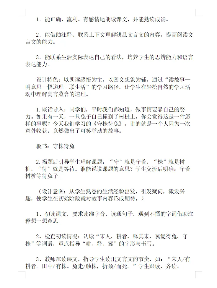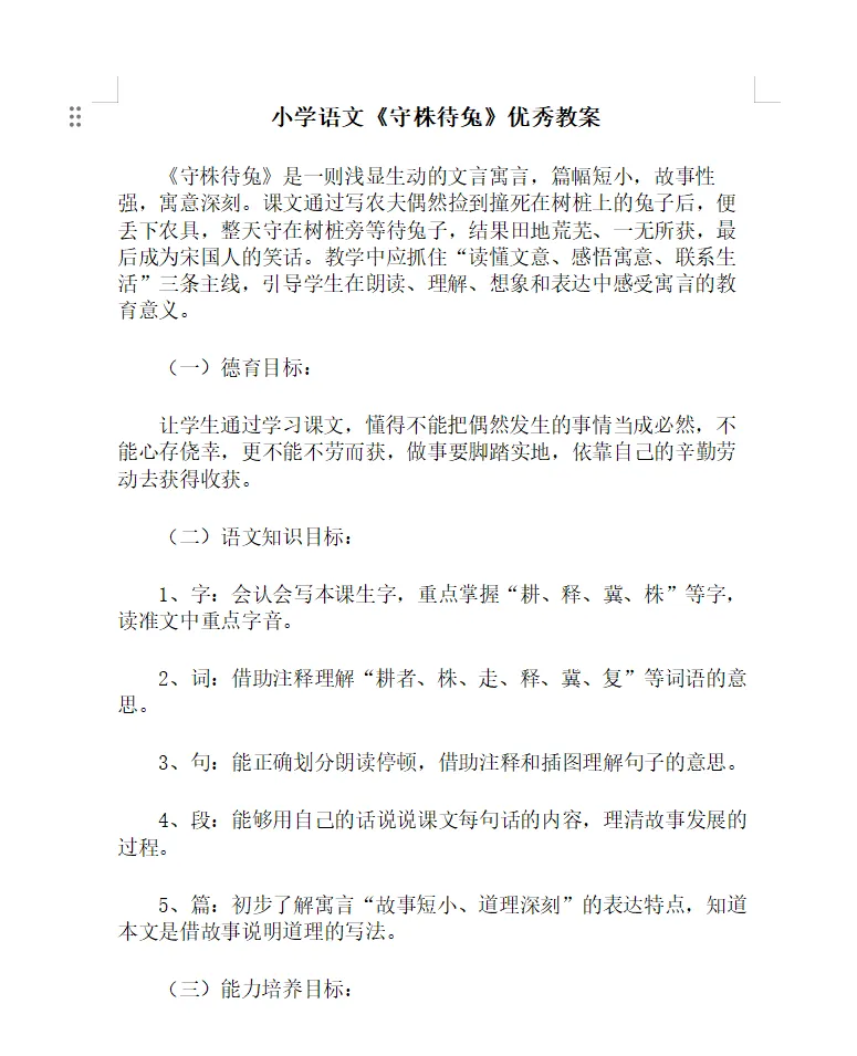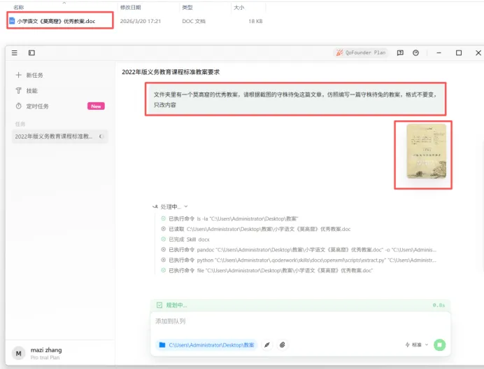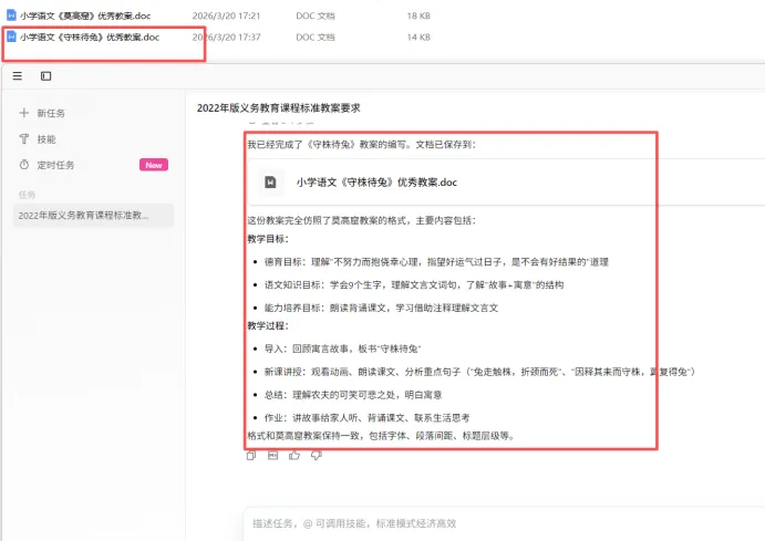 5.跟龙虾说:“文件夹里有一个莫高窟的优秀教案,请根据截图的守株持免这篇文章,仿照编写一篇守株待免的教案,格式不要变,只改内容”6.等待片刻,龙虾全程打工,把小学语文《守株待兔》优秀教案编写好了,并自动放在了文件夹里