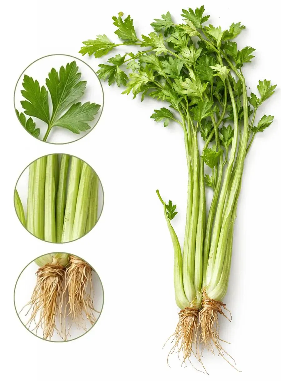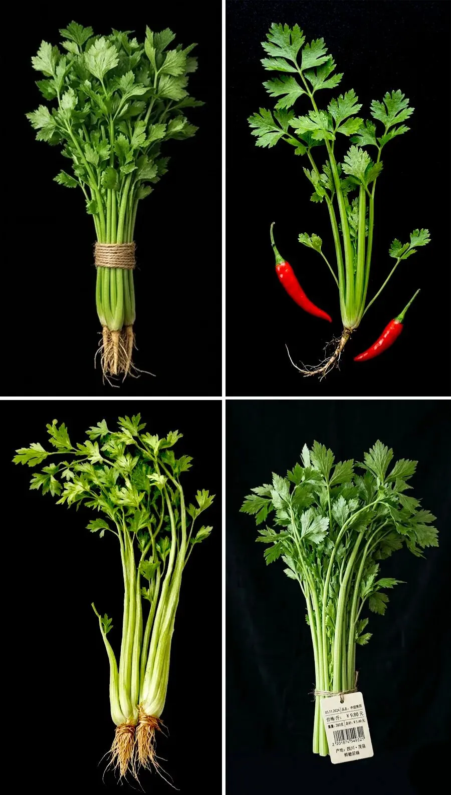 我们来看看芹菜长什么样子:它的叶子是一片一片分开的,像小羽毛一样,层层叠叠,非常丰富;它的茎杆细细长长,有的直,有的微微弯曲,而且上面还有一条一条的纹路。再仔细看看颜色,你会发现芹菜的绿色并不只有一种,有深绿、浅绿,还有一点点黄绿色,这些不同的绿色让它看起来更加生动、有层次呢!