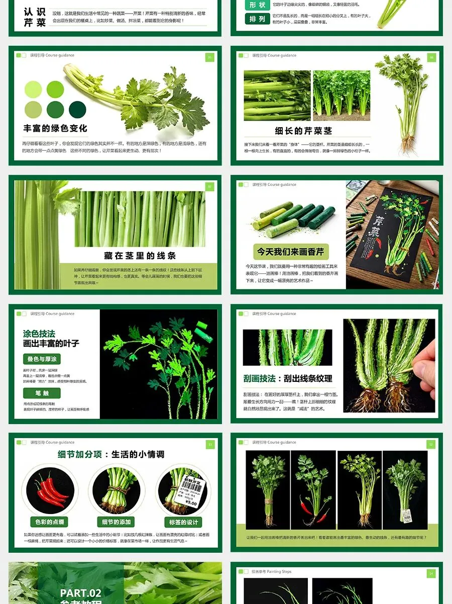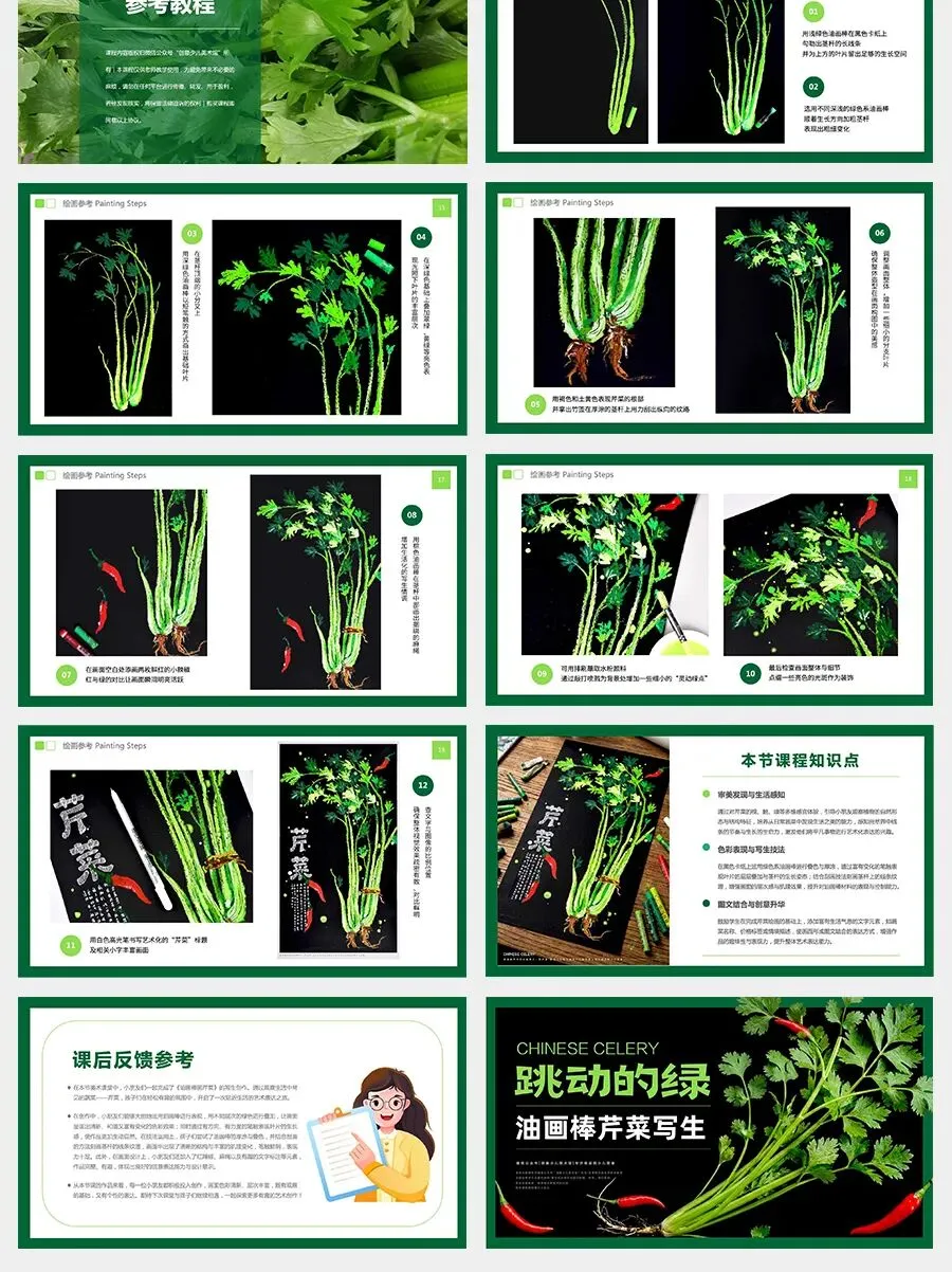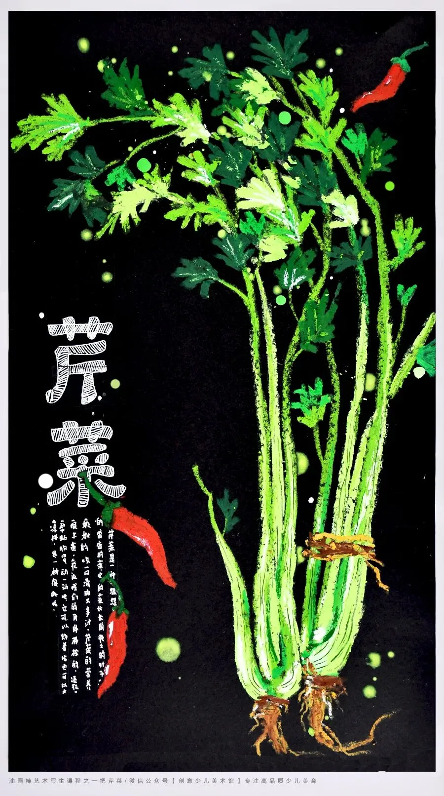 今天我们将用油画棒把芹菜画下来,用不同的绿色进行叠加表现叶子,用有力的笔触画出茎杆,还可以用刮画的方法表现细细的纹理。让我们一起开始创作吧!