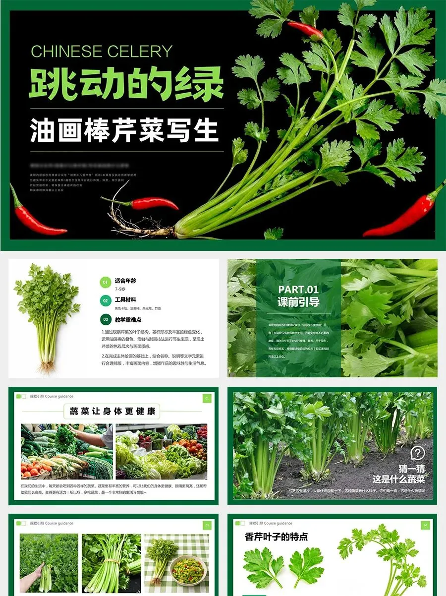 小朋友们,在我们的餐桌上,有很多绿色的蔬菜,你们平时有没有见过一种闻起来香香的、长得细细长长的蔬菜呢?没错,它就是我们今天要认识的主角——芹菜!