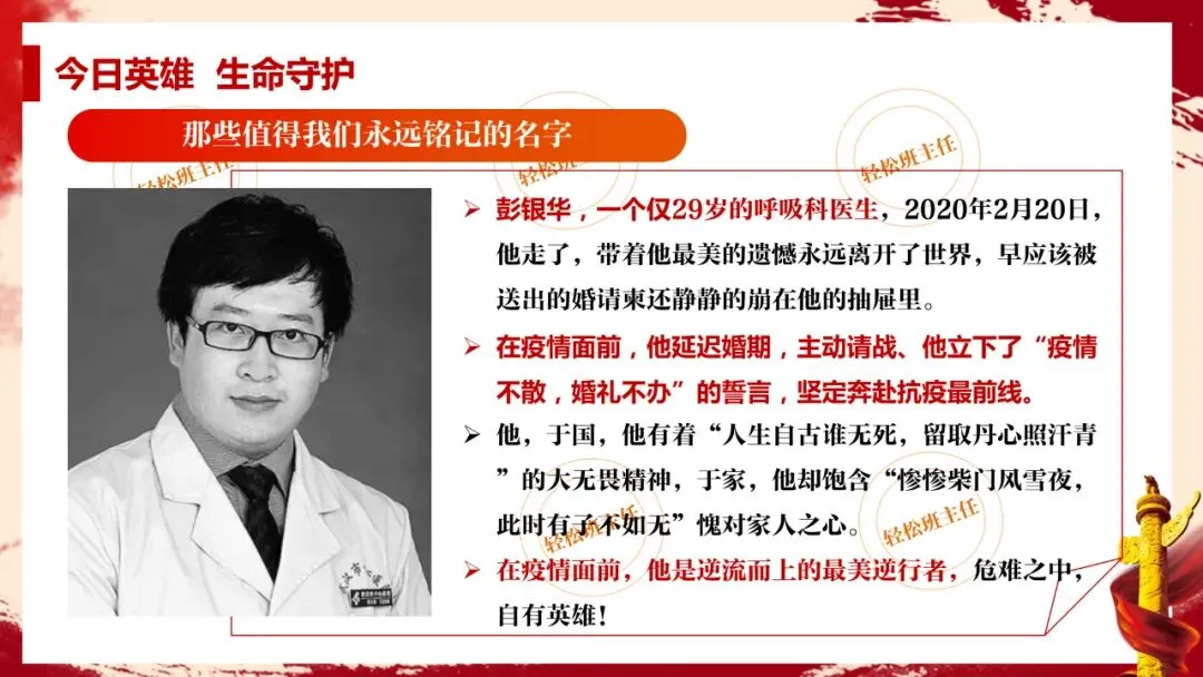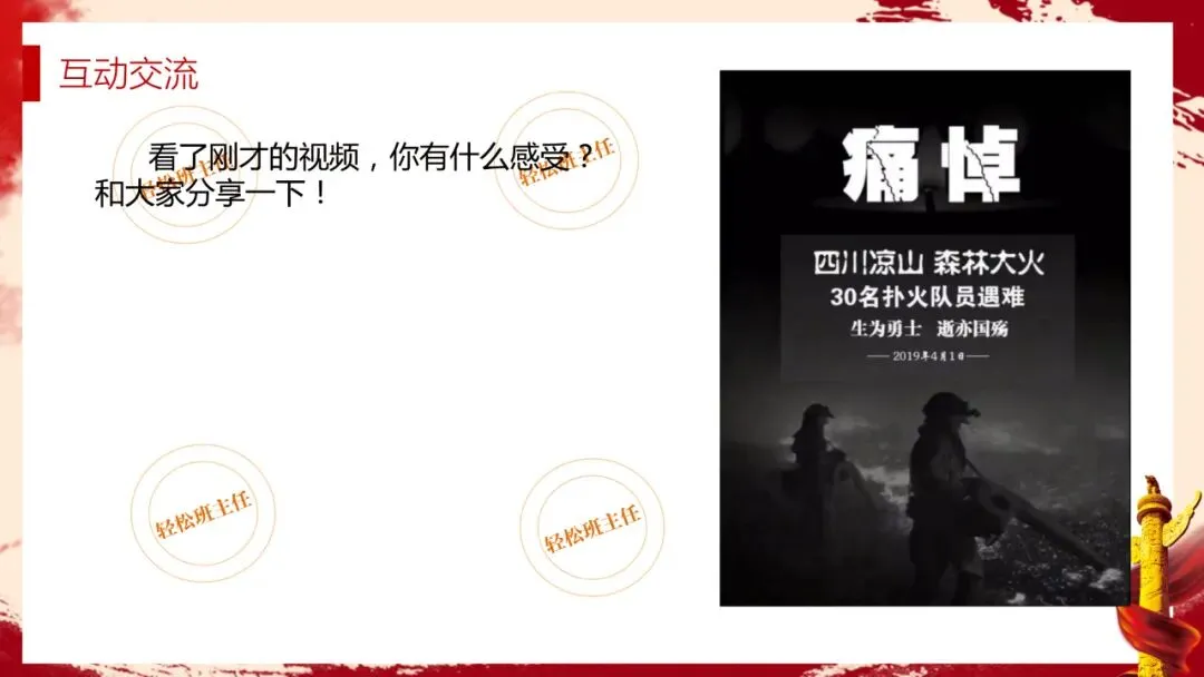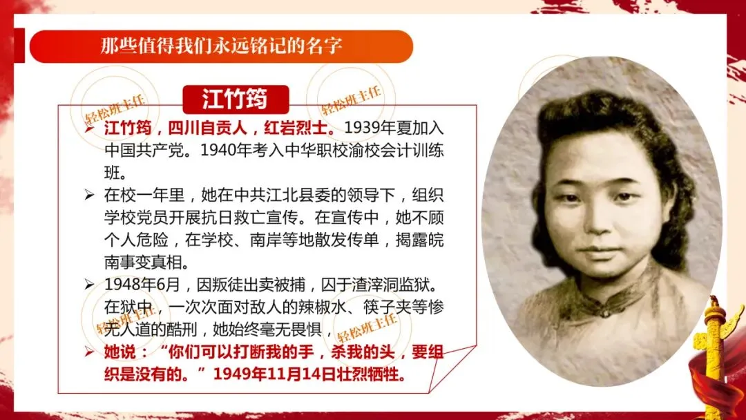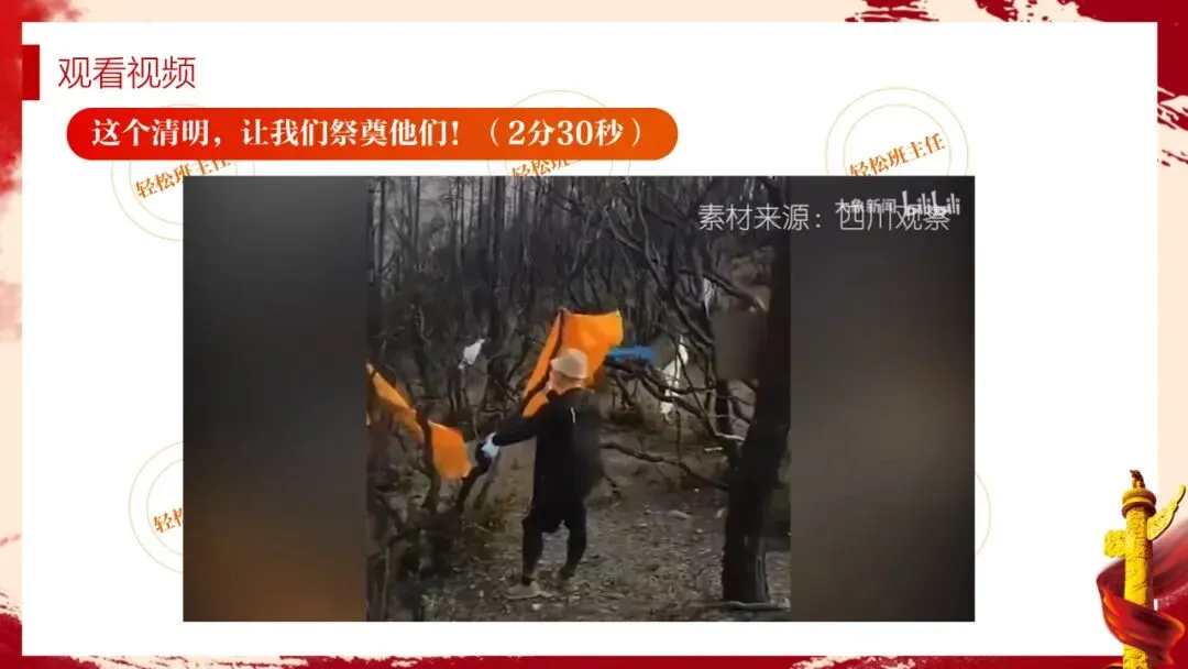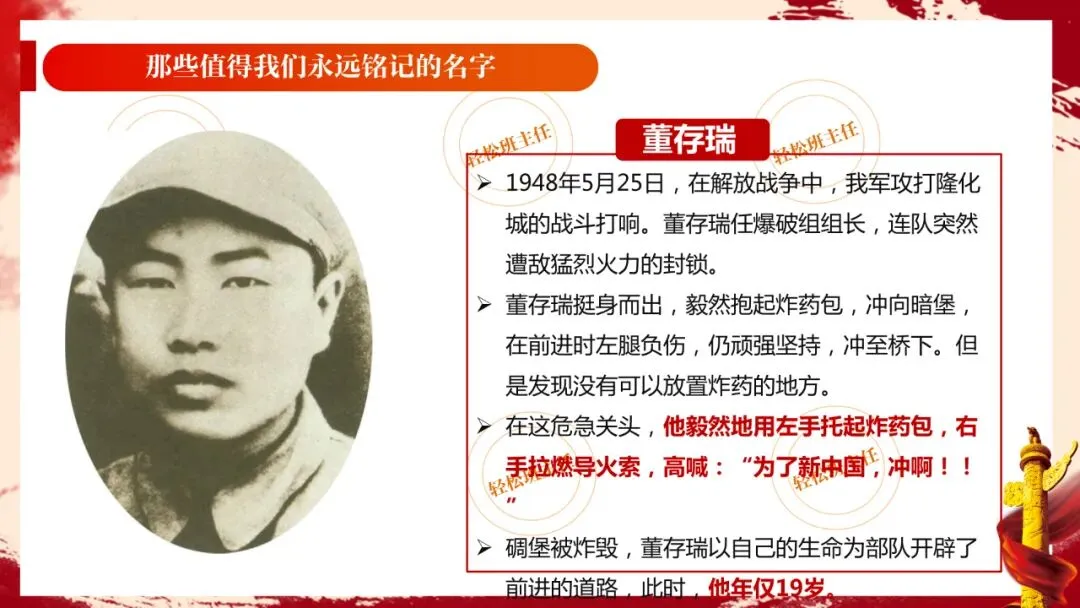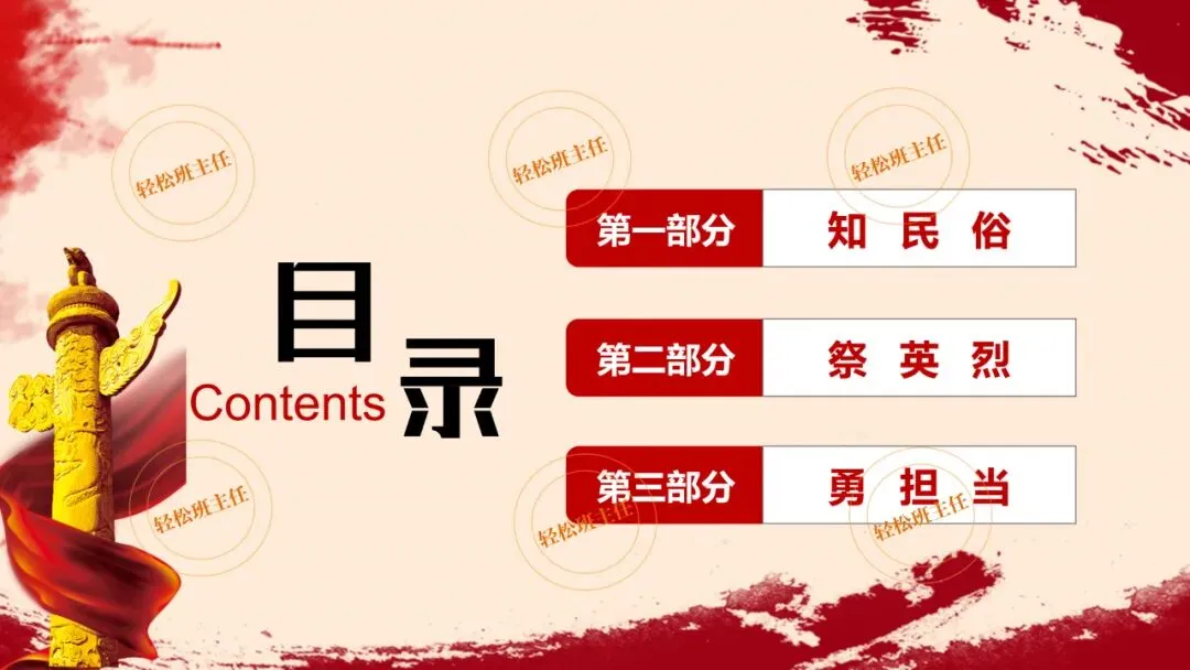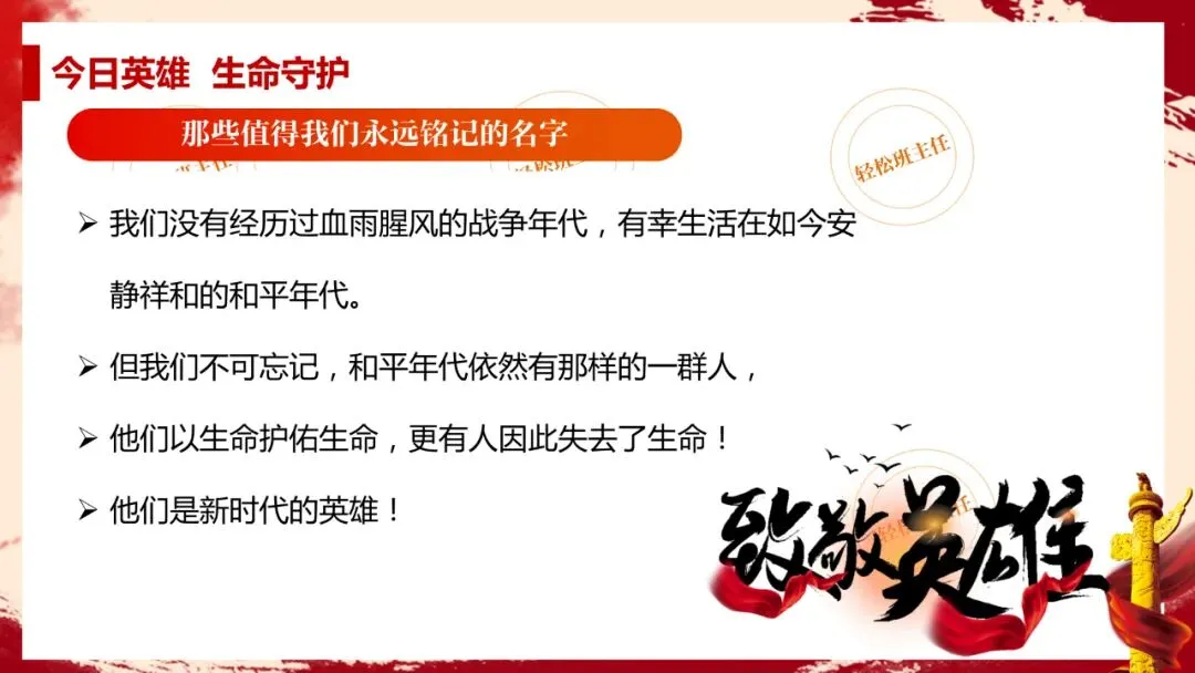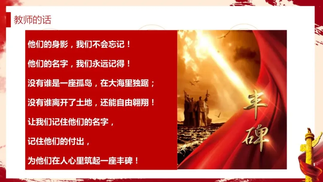 1.师:清明,我们在祭拜先祖、表达哀思时,更应该祭奠革命先烈们!因为总有那么一群最勇敢,最担当的人,在关键时刻挺身而出。他们为了人民的幸福和国家的富强,英勇战斗,不惧牺牲,永远地长眠于我们脚下的这片热土。他们用殷红的鲜血,书写了爱国主义最壮丽的诗篇!他们是时代的先锋,是中国的脊梁,是民族的骄傲!
