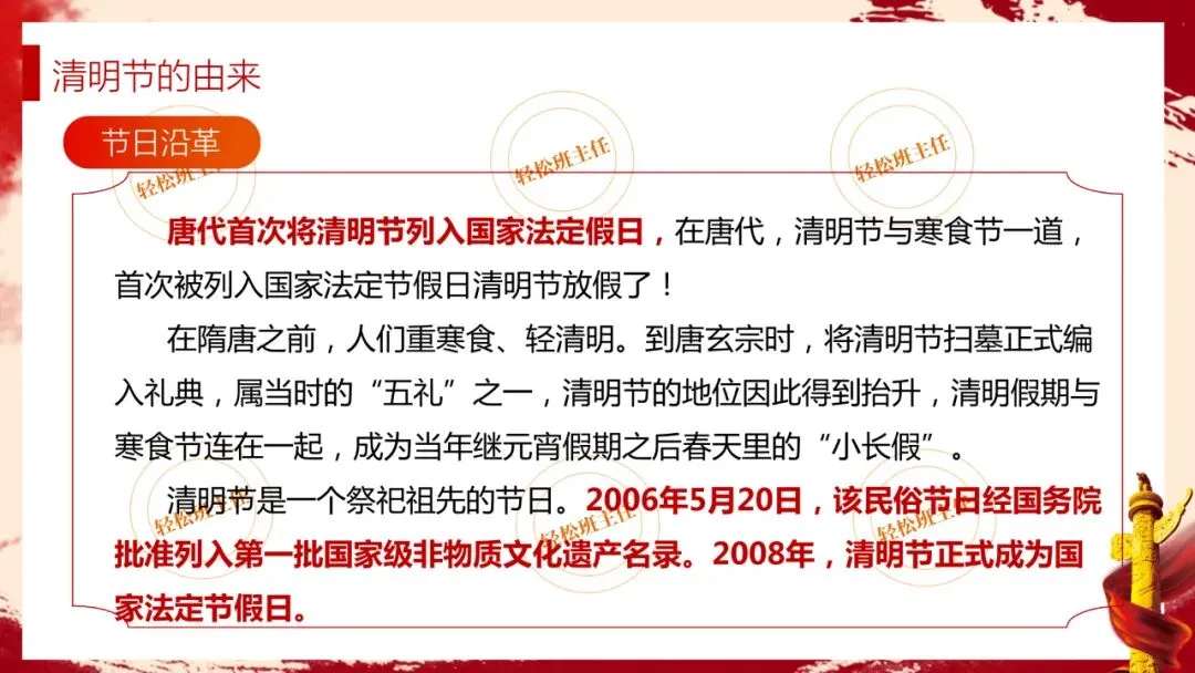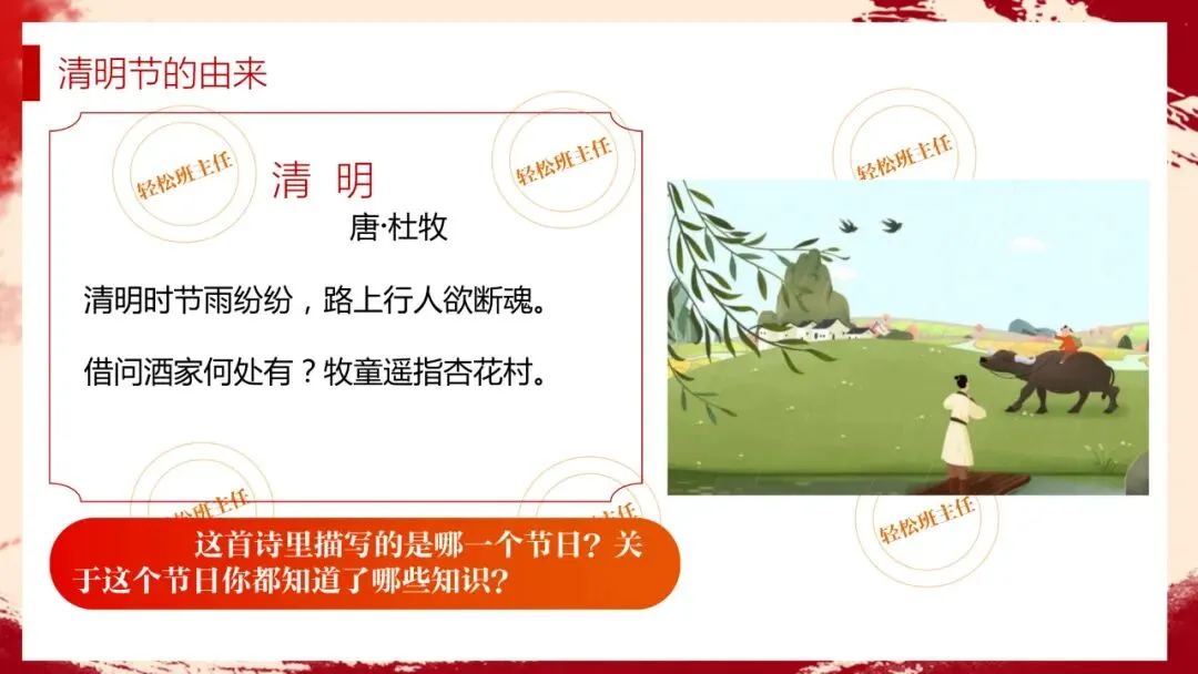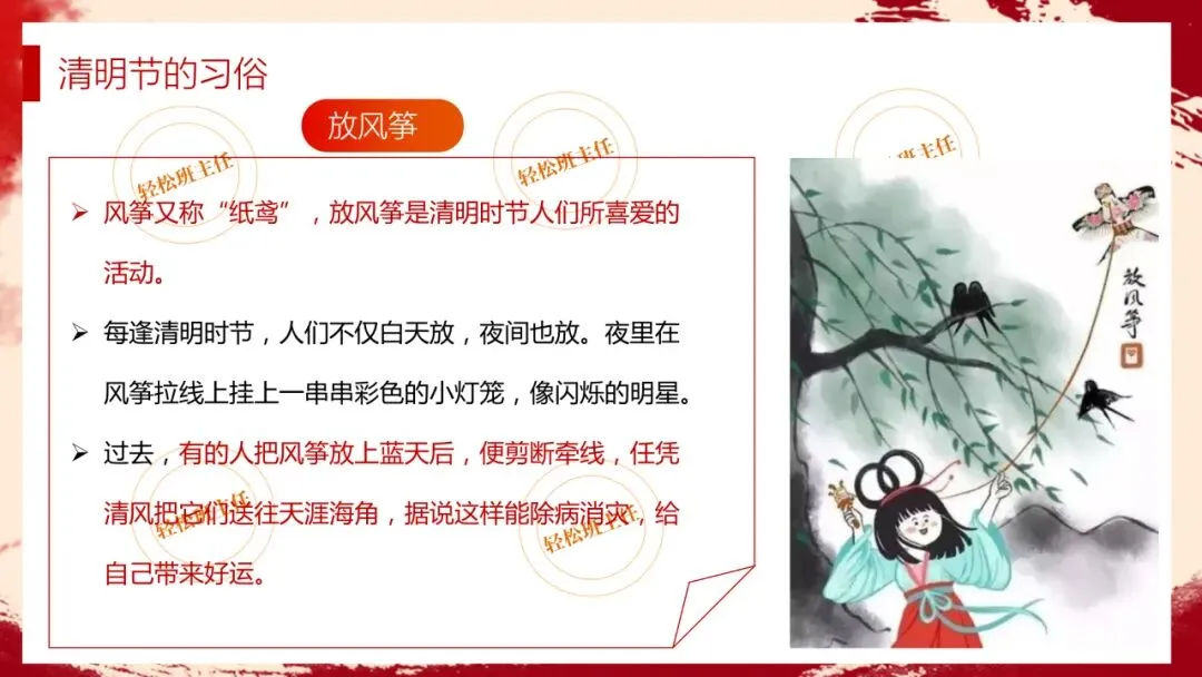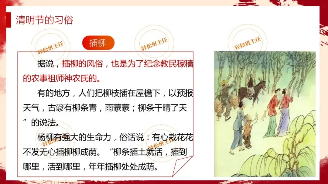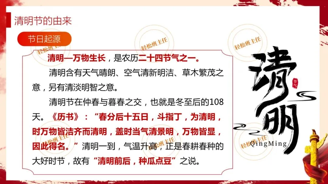 3.师:同学们了解的真不少!下面跟随PPT一起来全面了解清明节的由来及风俗惯。