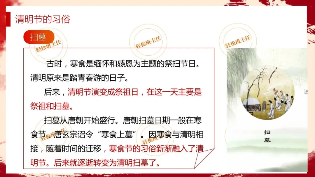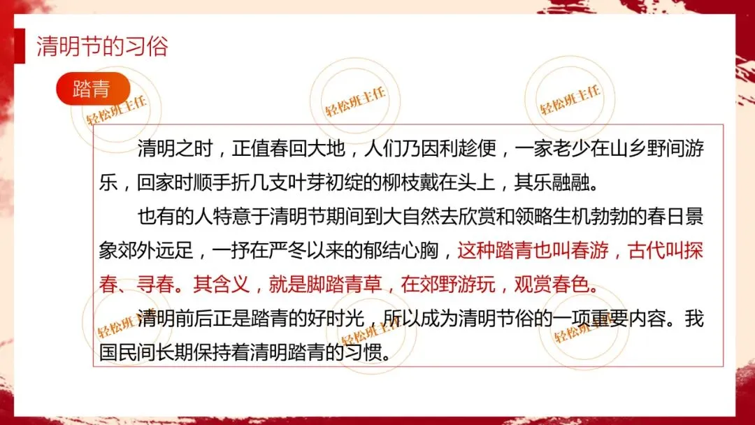 6.师:在历史里,清明节走过了岁月,形成了很多特有的习俗。