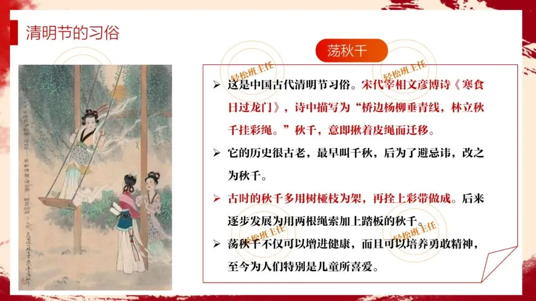 这是中国古代清明节习俗。宋代宰相文彦博诗《寒食日过龙门》,诗中描写为“桥边杨柳垂青线,林立秋千挂彩绳。”秋千,意即揪着皮绳而迁移。