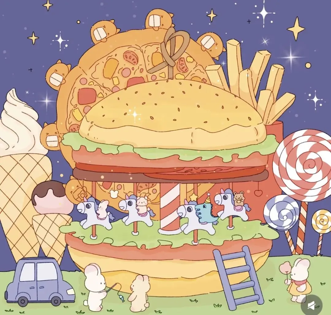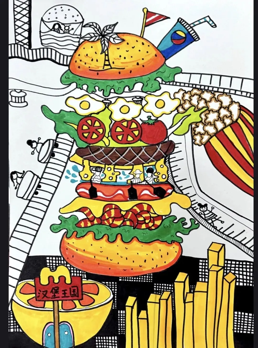 2. 分享交流:幼儿轮流介绍自己的作品:“我画了会飞的汉堡,用螺旋线装饰了面包,薯条变成了王国的小桥!”