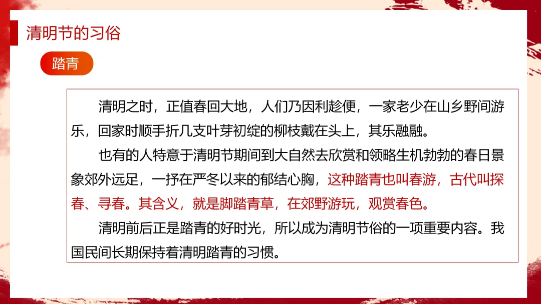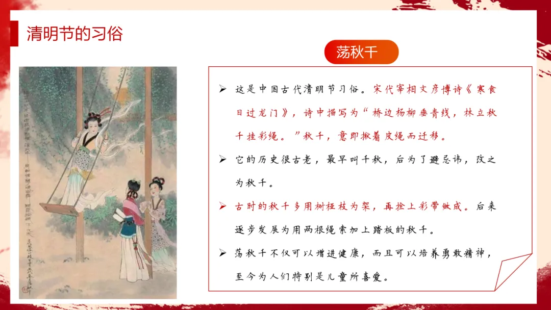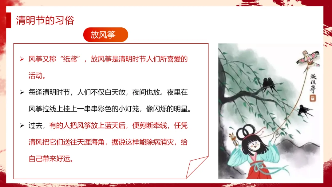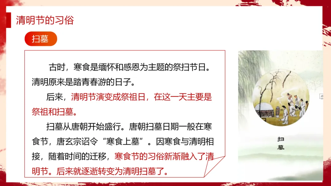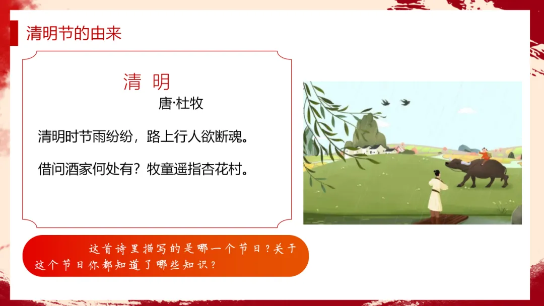 ✅民俗讲解不枯燥,从杜牧《清明》入题,把清明起源、扫墓/踏青/插柳等习俗讲透,顺带科普非遗、法定假日沿革,娃们听得进、记得住;