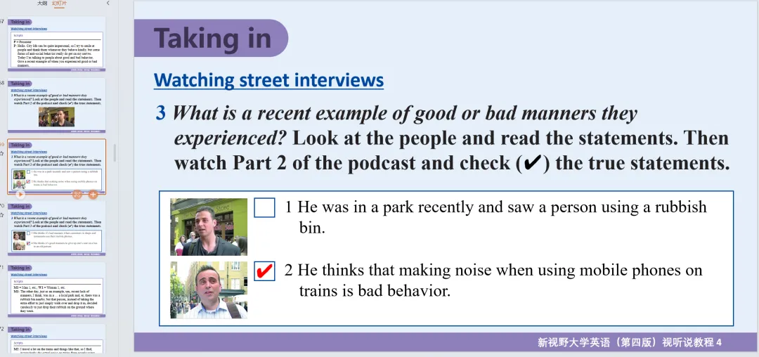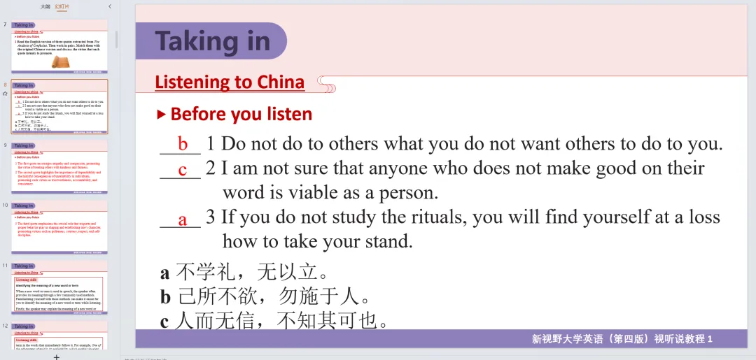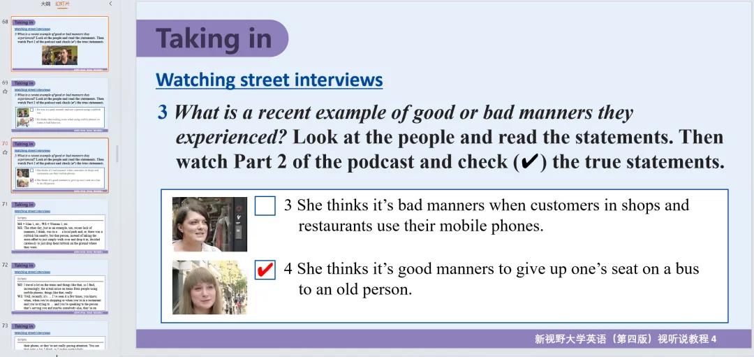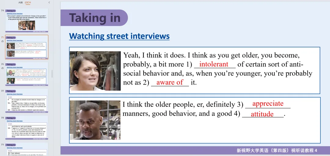 新视野大学英语视听说教程 第4册 参考答案+课件PPT+听力音频(第四版/思政智慧版)。课本答案和听力原文都在ppt里面!!!通过夸克网盘分享的文件:「听说教程4答案及听力原文」链接:https://pan.quark.cn/s/a65a0026473c