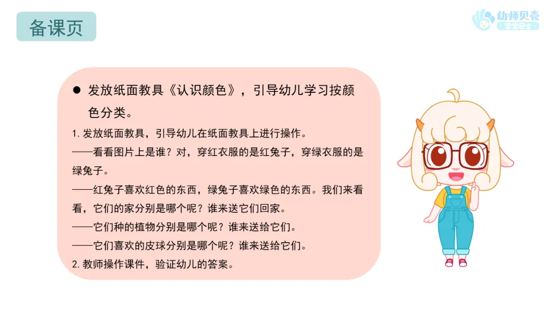 l纸面教具:《认识颜色》;红绿两只兔子、红绿萝卜若干、红绿圆形(数量为班级幼儿数)。