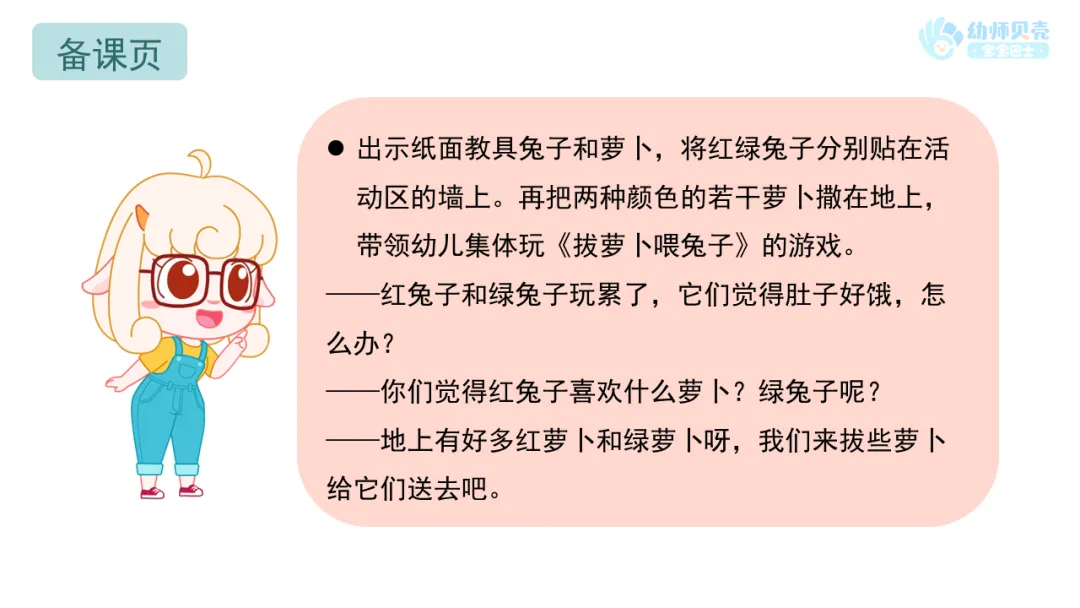 l出示纸面教具兔子和萝卜,将红绿兔子分别贴在活动区的墙上。再把两种颜色的若干萝卜撒在地上,带领幼儿集体玩《拔萝卜喂兔子》的游戏。