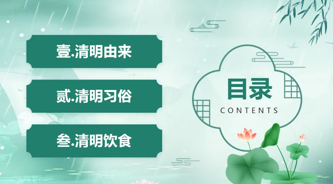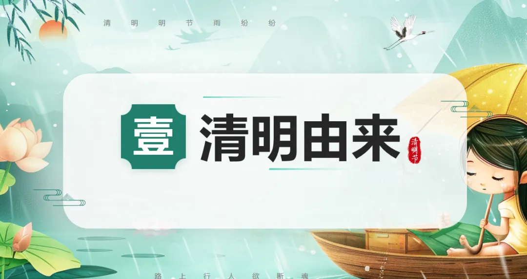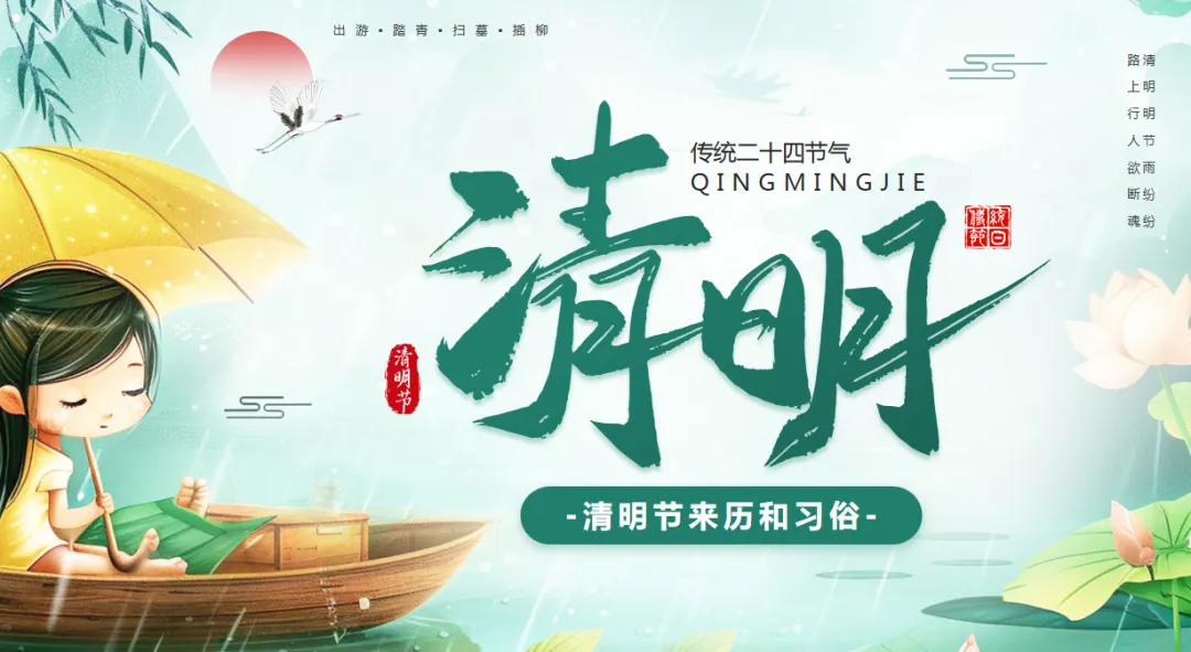 首先,同学们先想一想,你们听过“清明时节雨纷纷,路上行人欲断魂”这句诗吗?这是唐代诗人杜牧写的清明节,也是我们今天要聊的主角。清明节在公历四月五日前后,在仲春和暮春之交,《历书》里说“春分后十五日,斗指丁,为清明”,因为这个时候天气清朗、草木茂盛,万物都显得格外明净,所以取名“清明”。它可不只是一个节日,还是二十四节气里唯一既是节气又是节日的哦,到现在已经有2500多年的历史了,古时候人们还叫它踏青节、祭祖节、植树节呢。