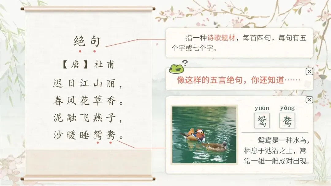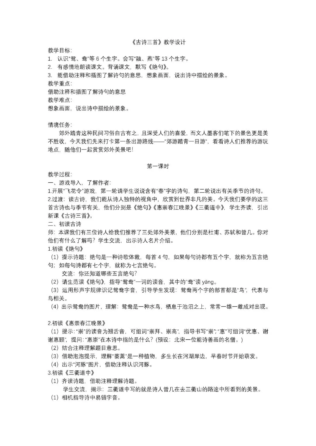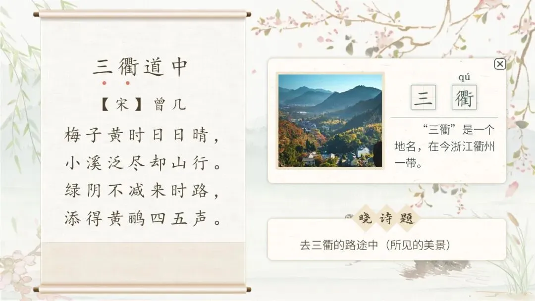 2.过渡:读古诗,我们能从诗人独特的视角中,欣赏到世界非凡的美。今天我们要学的这三首古诗也与季节有关,他们分别是《绝句》《惠崇春江晚景》《三衢道中》,学生齐读,引出新课《古诗三首》。
