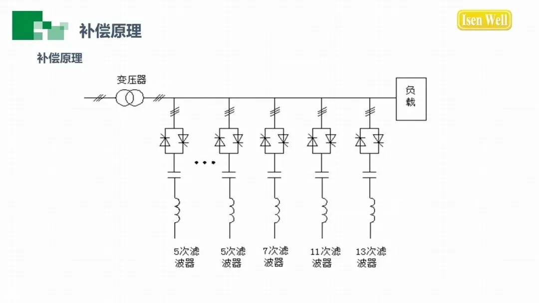 在各种电力电子装置中,三相桥式整流装置占的比例最大。三相六脉动相控电路交流侧的电流为互差120°的方波,经傅立叶分析该波形包含(6N±1)次谐波,理论上各次谐波含量为谐波次数的倒数。无功功率补偿原理