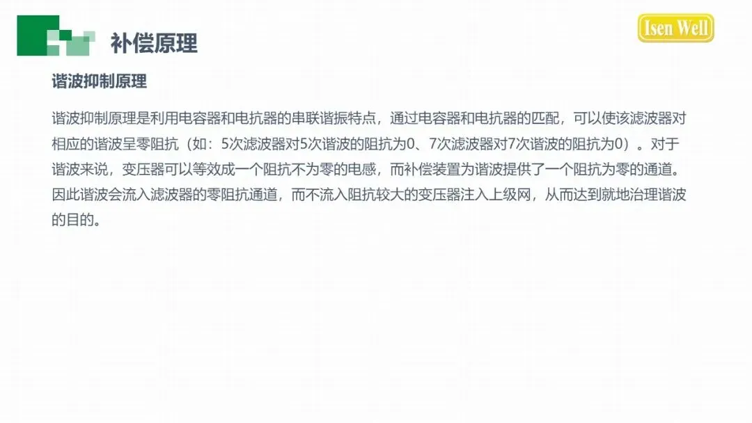 谐波抑制原理是利用电容器和电抗器的串联谐振特点,通过电容器和电抗器的匹配,可以使该滤波器对相应的谐波呈零阻抗(如:5次滤波器对5次谐波的阻抗为0、7次滤波器对7次谐波的阻抗为0)。对于谐波来说,变压器可以等效成一个阻抗不为零的电感,而补偿装置为谐波提供了一个阻抗为零的通道。因此谐波会流入滤波器的零阻抗通道,而不流入阻抗较大的变压器注入上级网,从而达到就地治理谐波的目的。