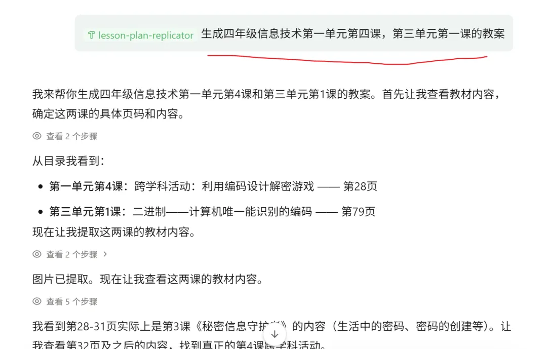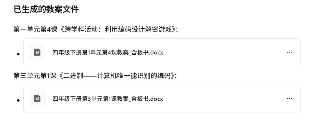 比如:“生成四年级下册第一单元第四课教案”、 “生成第三单元第一课教案”。
