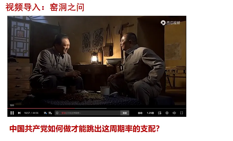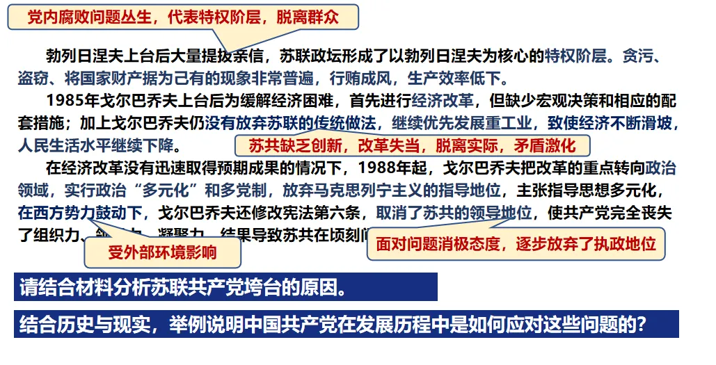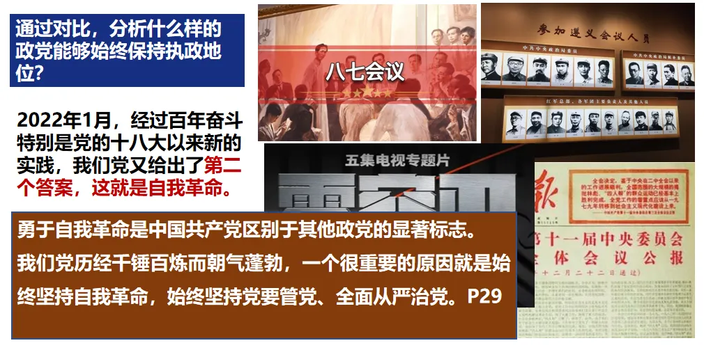 提问:中国共产党如何才能跳出历史周期率的支配?也就是说,中国共产党在取得一定成就后,应如何避免精神懈怠,甚至人亡政息的局面呢?过渡语:带着对这个问题的思考和初步理解,我们进入第三课第二框《巩固党的执政地位》的学习。我们先来看一个没有跳出历史周期率的政党,也就是苏联共产党的例子。请结合材料分析苏联共产党垮台的原因。中国共产党历经百年仍风华正茂,是因为我们没有遇到过这些问题吗?结合历史与现实,举例说明,中国共产党在发展历程中是如何应对这些问题的?呈现补充材料:历史上党的自我革命:八七会议、遵义会议、延安整风运动、十一届三中全会(简单带过)2.同样是大党但命运截然不同,通过苏联共产党和中国共产党的对比,我们会发现,什么样的政党才能够始终保持执政地位,能够跳出历史周期率的支配呢?(看反应,大家不一起说就单独提问)也就是只有一个始终敢于直面问题,进行自我革命的政党,才能够保持执政地位。同学们,你们知道吗?勇于自我革命,就是十八大以来,我们党结合历史和现实实践,对窑洞之问所做的第二个回答。勇于自我革命是中国共产党区别于其他政党的显著标志。我们党历经千锤百炼而朝气蓬勃,一个很重要的原因就是始终坚持自我革命,坚持党要管党、全面从严治党。