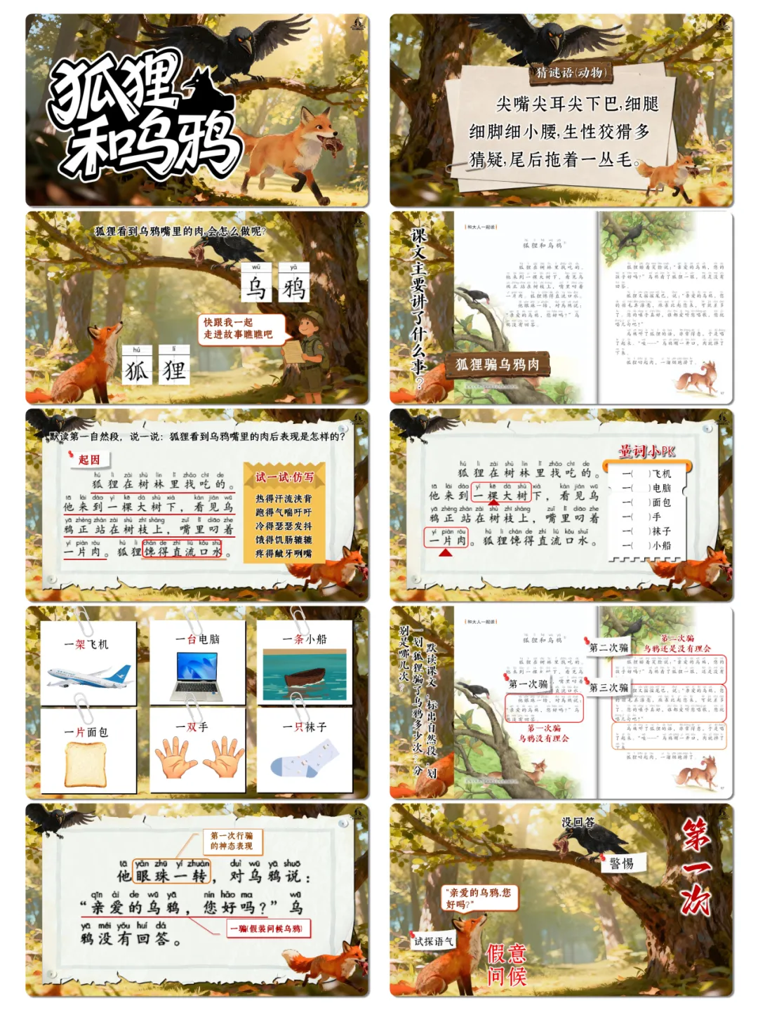 1. 认识“狐、狸、鸦”等生字,掌握“一(片)肉、一(架)飞机”等量词搭配,积累“馋得直流口水”这类“X得XX”式短语及轻声词语,丰富基础语言储备。