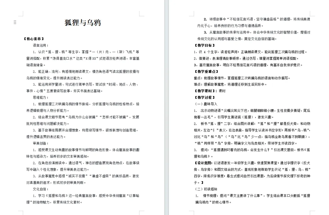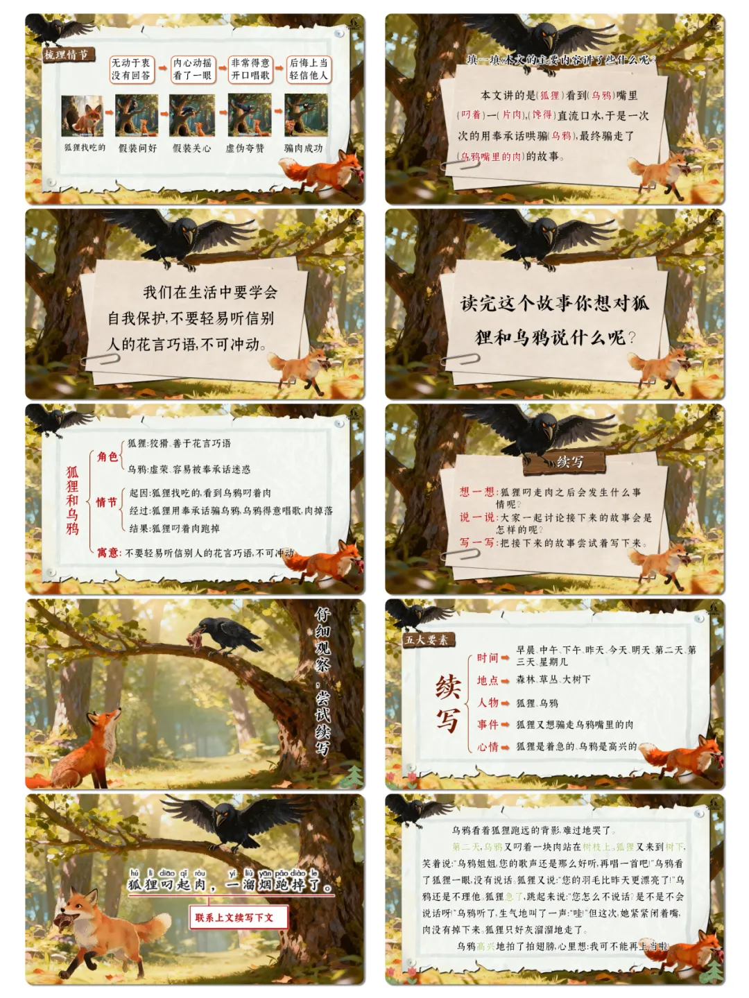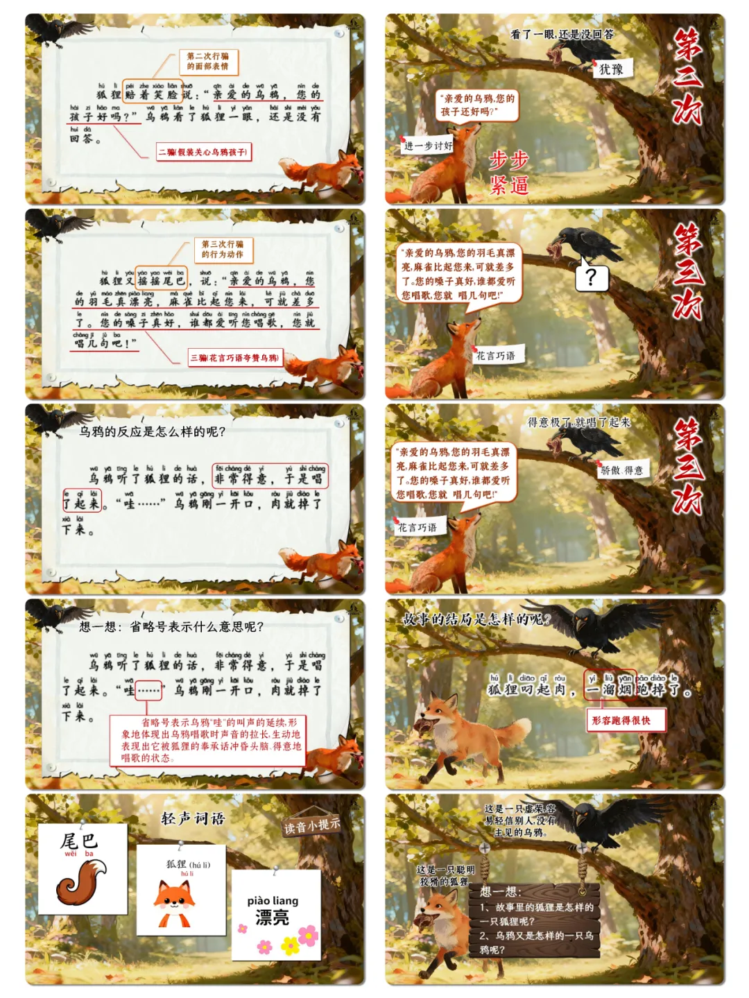 2. 能正确、流利、有感情地朗读课文,模仿角色语气读出狐狸的狡猾与乌鸦的情绪变化,提升朗读表达能力。