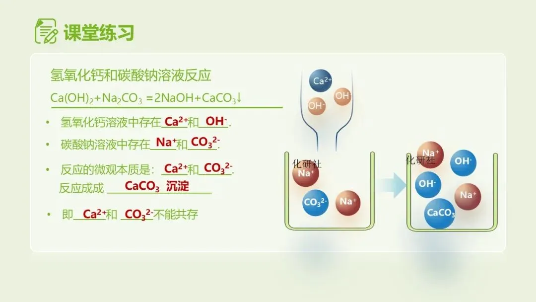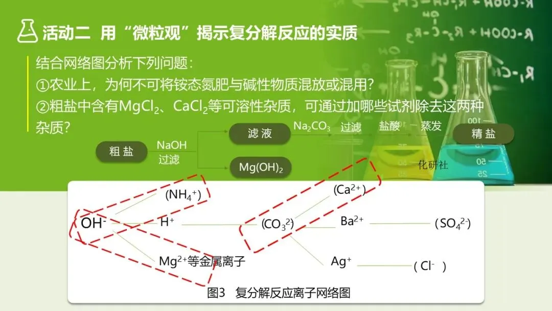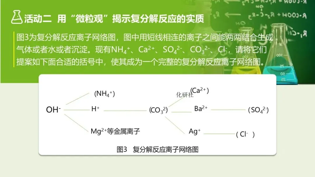 1. 展示复分解反应离子网络图,给出离子:NH₄⁺、Ca²⁺、SO₄²⁻、CO₃²⁻、Cl⁻,请学生填入对应位置,形成 “离子结合图谱”。