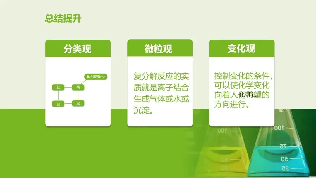 同学们,初中化学我们学过化合、分解、置换、复分解四大基本反应类型。其中最复杂、考得最多、最难掌握的就是复分解反应。很多同学判断反应、书写方程式、做推断题时频频出错,就是因为没有真正 “读懂” 它。今天我们换一种方式 —— 用分类观、微粒观、变化观,三重视角《再识复分解反应》,把它彻底学透。