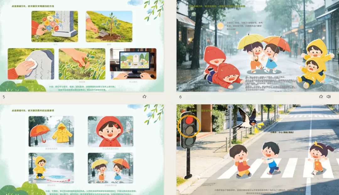 1.雨天安全,引导幼儿了解清明节雨天外出时需要注意的安全事项。